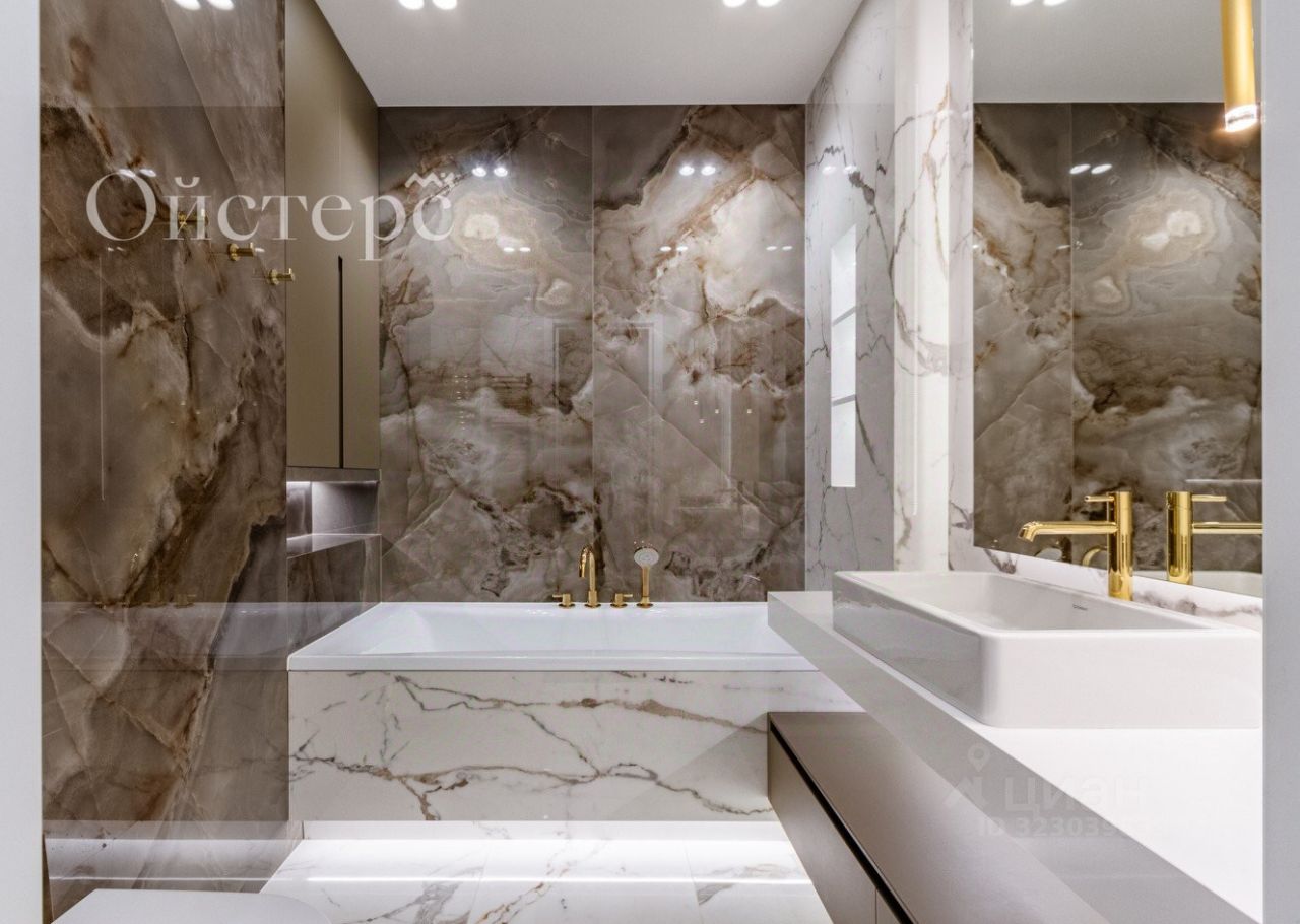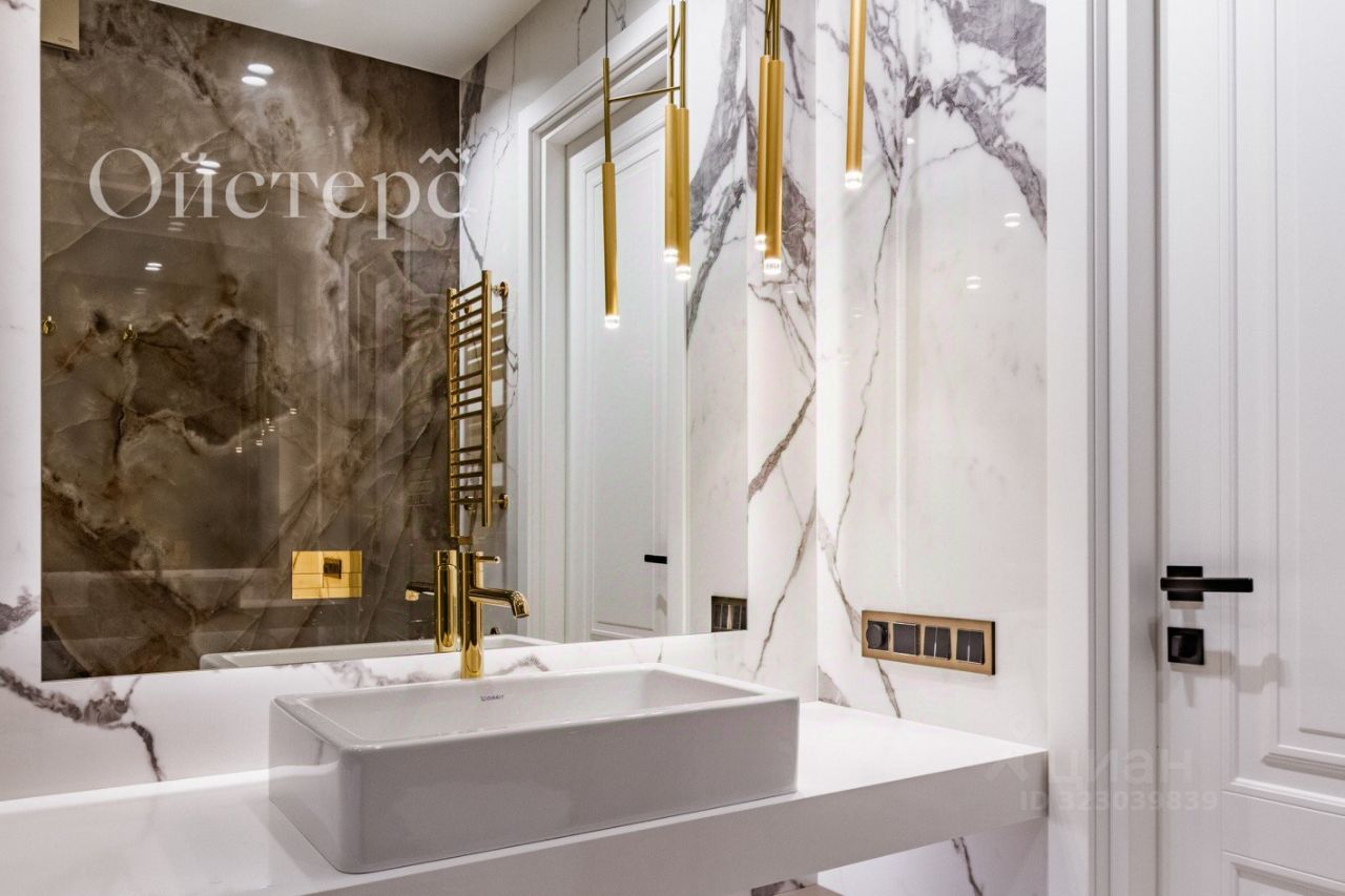 В отделке использованы материалы премиального уровня: сантехника Villeroy & Boch, крупноформатный керамогранит итальянской фабрики REX, паркет ''французская ёлка'' и дизайнерские элементы, выполненные по индивидуальным проектам.