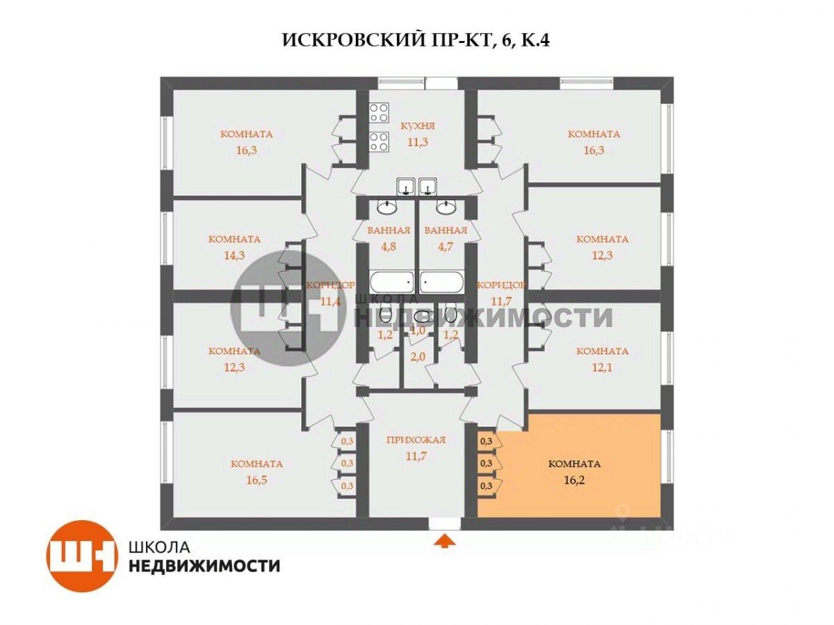 Продается комната 16.2 квм в восьмикомнатной 182.8 квм коммунальной квартире в Невском районе Санкт-Петербурга.