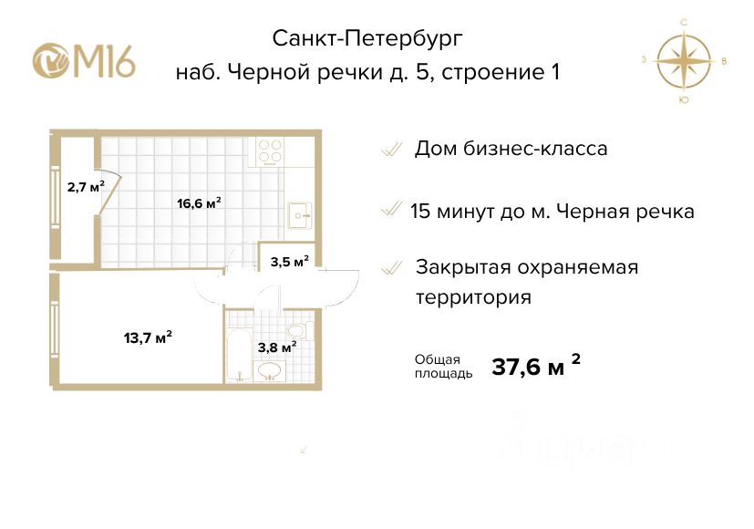 Планировка включает в себя просторную кухню-гостиную 16.6 кв.м., спальную комнату 13.7 кв.м., коридор 3.5 кв.м. с нишей под шкаф и лоджию 2.7 кв.м.