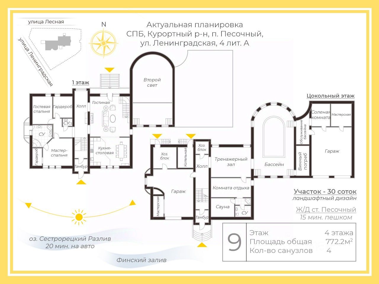 На первом этаже всё обустроено для вашего отдыха и здоровья: спортивный зал с тренажерами и бильярдным столом, отдельный зал с десятиметровым бассейном с функцией массажа, сауна с печкой на дровах, а также солевая комната.