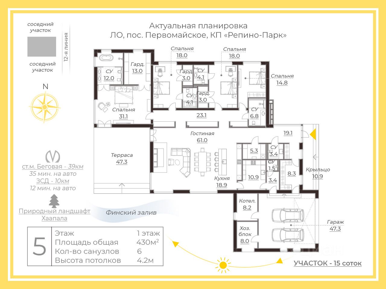 Поселок ''Репино Парк'' окружен великолепной природой с озером и огромным парком площадью 23 гектара, где ваши дети найдут развлечения и смогут завести новых друзей. В поселке также есть спортивные и детские площадки, теннисный корт, что позволит всей семье наслаждаться активным отдыхом. Всего 5 минут до Финского залива и популярных ресторанов, 20 минут до центра города удобное расположение делает это место идеальным для круглогодичного проживания.