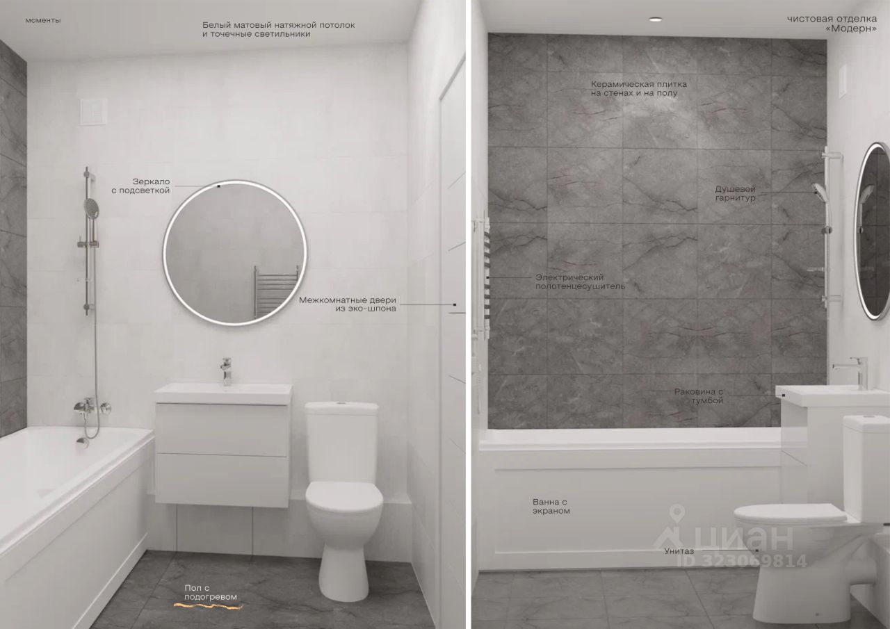В Живых кварталах Моменты три вида отделки. В чистовую отделку входит: • Входная сейф-дверь • Мастер-выключатель • Ламинат 33 класса • Виниловые обои • Межкомнатные двери из эко-шпона • Белый матовый натяжной потолок • Стальные радиаторы с терморегулятором • В санузлах: - керамическая плитка на полу и стенах от пола до потолка - раковина с тумбой - зеркало с подсветкой - акриловая ванная с экраном - теплый пол - электрический полотенцесушитель - установлена вся сантехника