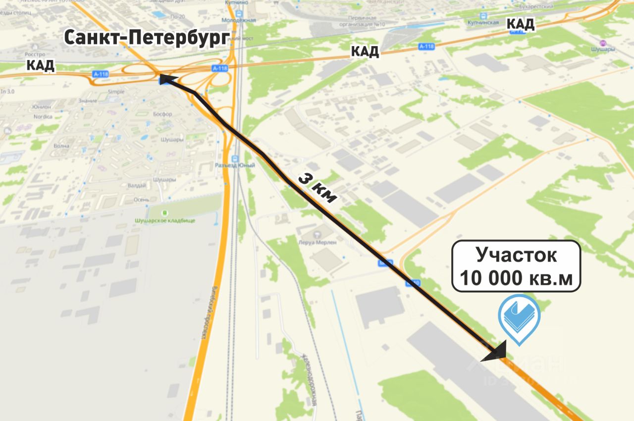 Продажа уникального земельного участка 10 000 кв.м. (из участка общей площадью 7,5 Га) расположенного по адресу: Санкт-Петербурга поселок Шушары, Московское шоссе, земельный участок 505, в 3 км до КАД на въезде в город.