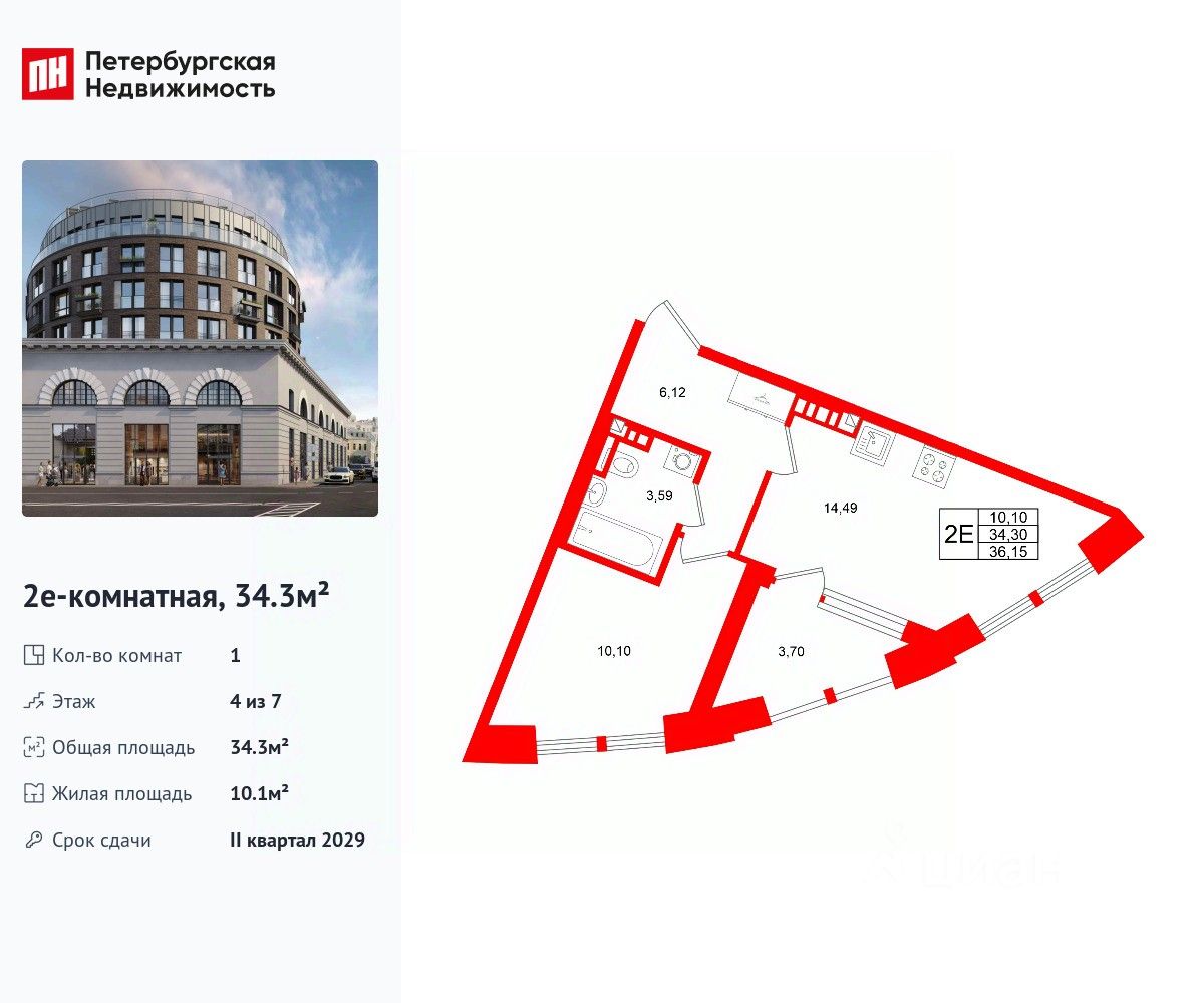 Удобная, классическая, функциональная европланировка, большая кухня-гостиная 14.49 м², просторная прихожая 6.12 м². Общая площадь квартиры - 34.3 м², жилая 10.1 м², высота потолка 3 м.