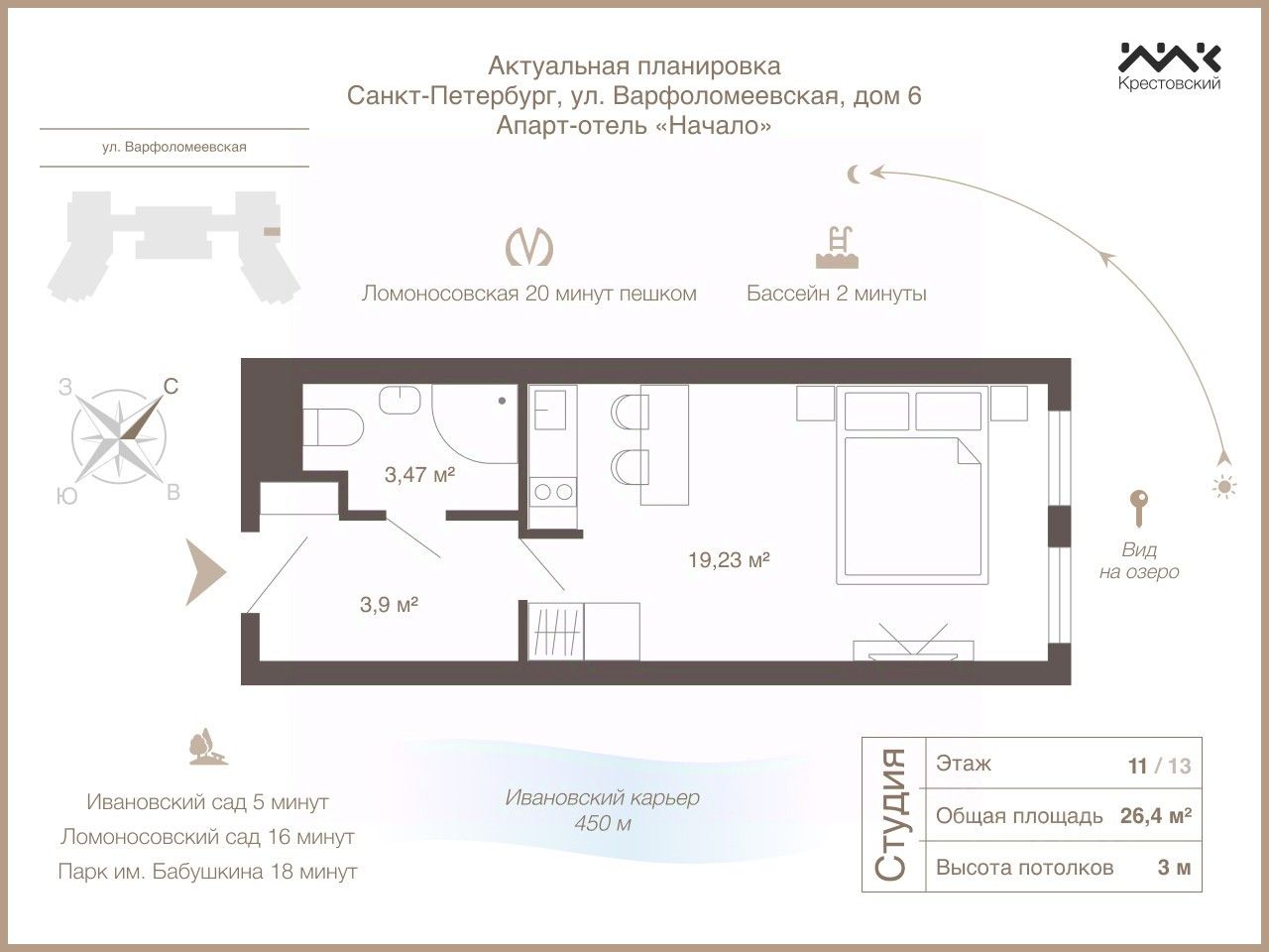 Апартаменты находятся на берегу Ивановского озера, что создаёт уникальную ценность и привлекательность для арендаторов. Современная развитая инфраструктура района — кофейни, магазины, благоустроенный берег, спортивные площадки, парки, сады и школы — обеспечивает круглогодичную загрузку и комфорт проживания.