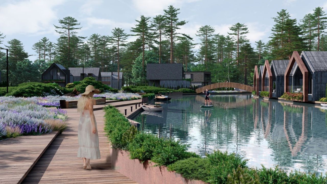 Forest Village - это единая социальная среда, лаконичная архитектура и основной акцент сделан на колоссальное количество прогулочных зон и велодорожек (16 км). Здесь также будет собственный судоходный канал с причалом для лодок. Наши каналы централизовано сообщаются с озером, которое образовалось благодаря карьеру с намывным песком, поэтому вода в канале лазурно-голубого цвета.