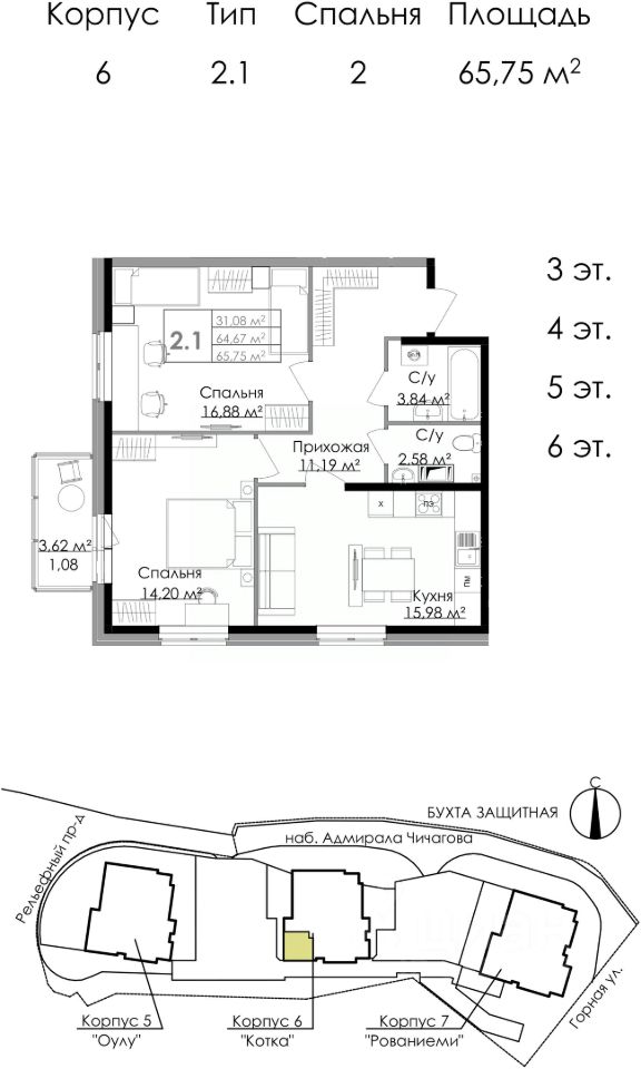 Продаётся 2-комнатная квартира в сданном доме (Дом М6 - Котка), срок сдачи: IV-кв. 2023, общей площадью 65.75 кв.м., на 5 этаже. ЖИЛОЙ КОМПЛЕКС В ВЫБОРГЕ