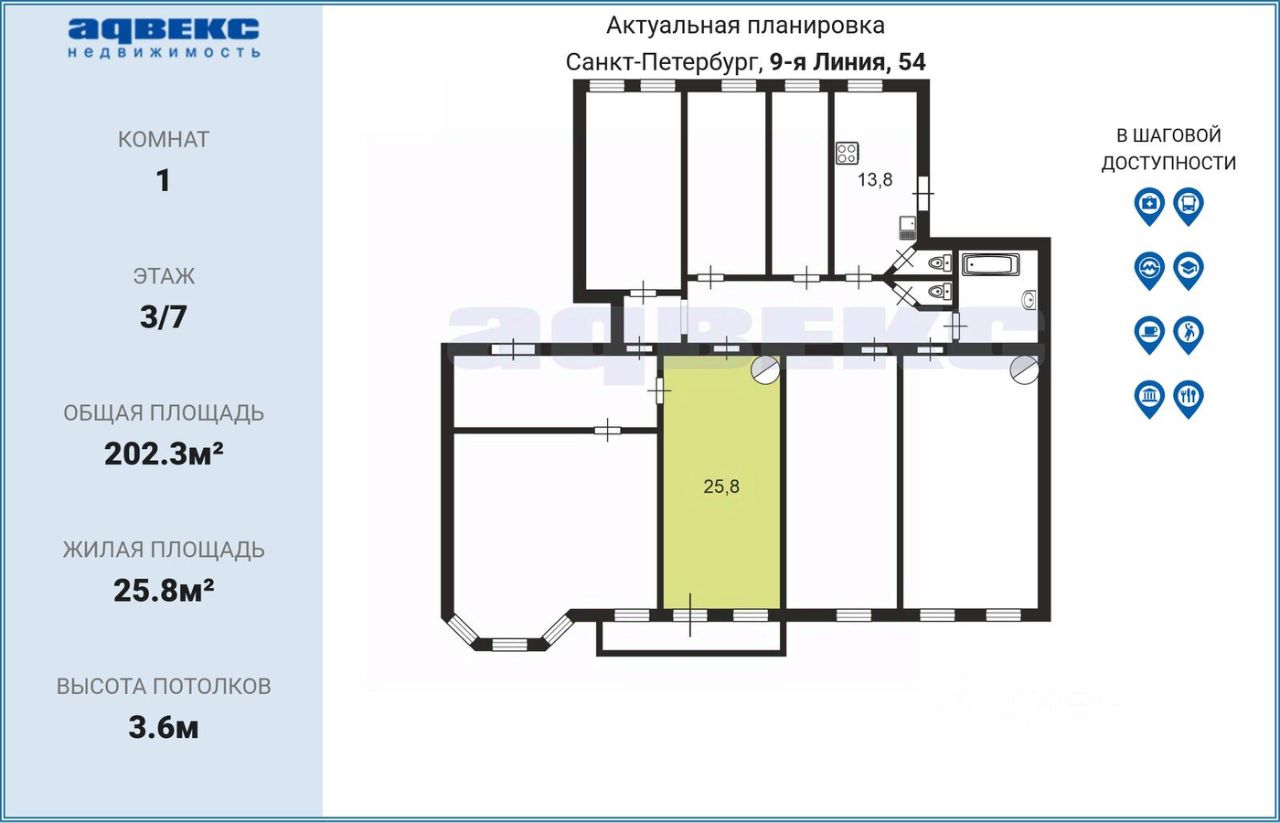 ID: 1787831 Продаётся в доме на Васильевском острове , 9 линия , красивая комната с большим балконом . Комната правильной формы 25,8 м. кв . , сохранена лепнина. Дом с железобетонными перекрытиями , 1905 г. Неоклассицизм . Арх. К. Маккензен Видовая комната. Высокие потолки 3,6 м. В комнате два окна и выход на балкон 6 метров. Напротив старинная действующая церковь Благовещенская Пресвятой Богородицы, действующая, освещена в 1762 в году. Комната удачно разделена на две - гостиную и столовую. , они соединены аркой. Квартира чистая , опрятная , соседи спокойные и дружелюбные .,проживают в квартире ещё три человека. В квартире продаются ещё две изолированные комнаты 19 кв м и 14 кв м , окна во двор. Квартира имеет одну хорошую общую техническую комнату - кладовую с окном -МОП. В квартире два туалета и отдельная ванная комната. Квартира имеет два входа : парадный на улицу и во двор и при желании можно эту квартиру разделить на две квартиры каждая со свои входном. Район с многовековой историей. В пешей доступности дет. сады,школы, лицей федерального значения физико-математический N 30, гимназия N 32 . Двор дома с озеленением и площадкой отдыха. Магазины, поликлиника- всё рядом. Любая транспортная наземная доступность , метро''Василеостровская ''7 мин пеш, метро ''Спортивная '' 12 пеш., метро '' Горный '' 4 тр. . Парадная -домофон, новый лифт, лестница опрятная , чистая широкая, лёгкая на подъем. Нотариальные отказы на руках. Активное место города для энергичных людей. Это Ваш правильный выбор! Звоните! Договоримся! Елена.