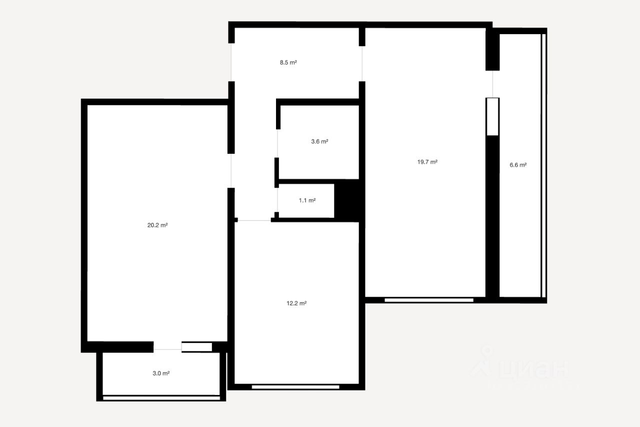 Общая - 64,6 м² Комнаты раздельные - 20,02 м² / 19,95 м² Кухня - 12,07 м² 2 Большие застеклённые лоджии - 6,9 м² и 3,5 м² (отделка пола: влагостойкая доска)