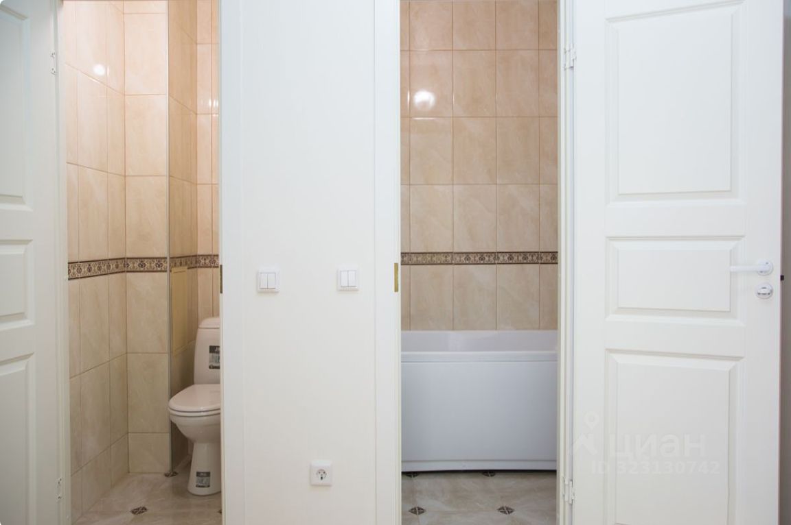 Санузел Пол: ванна — керамическая плитка темного цвета, санузел — керамическая плитка темно-бежевого цвета Стены: керамическая плитка светло-бежевый верх и низ Потолок: натяжной Электрика: выключатели Сантехника: смеситель для ванной, смеситель для раковины, унитаз, ванна, раковина Прочее: дверные блоки цвета белый, наличники, фурнитура, ревизионный люк цвет белый