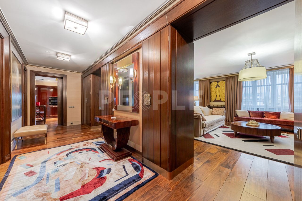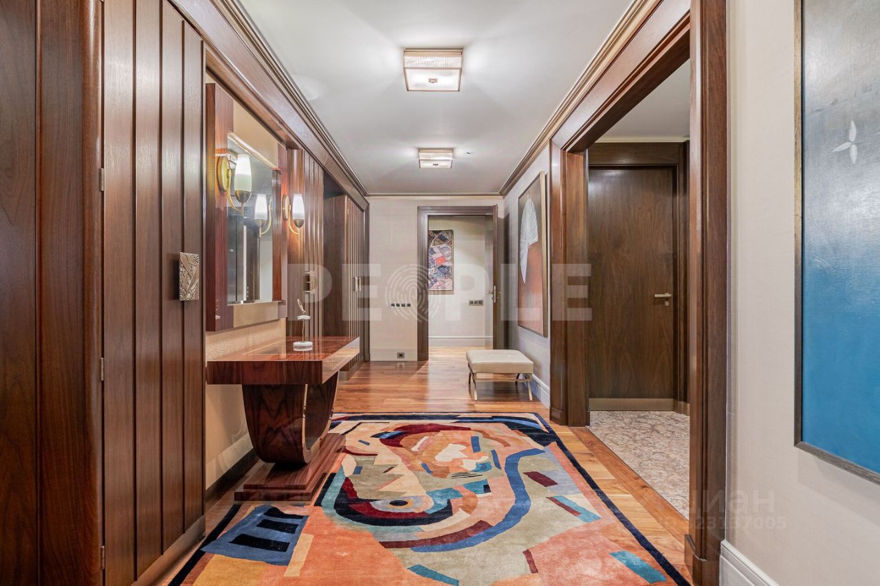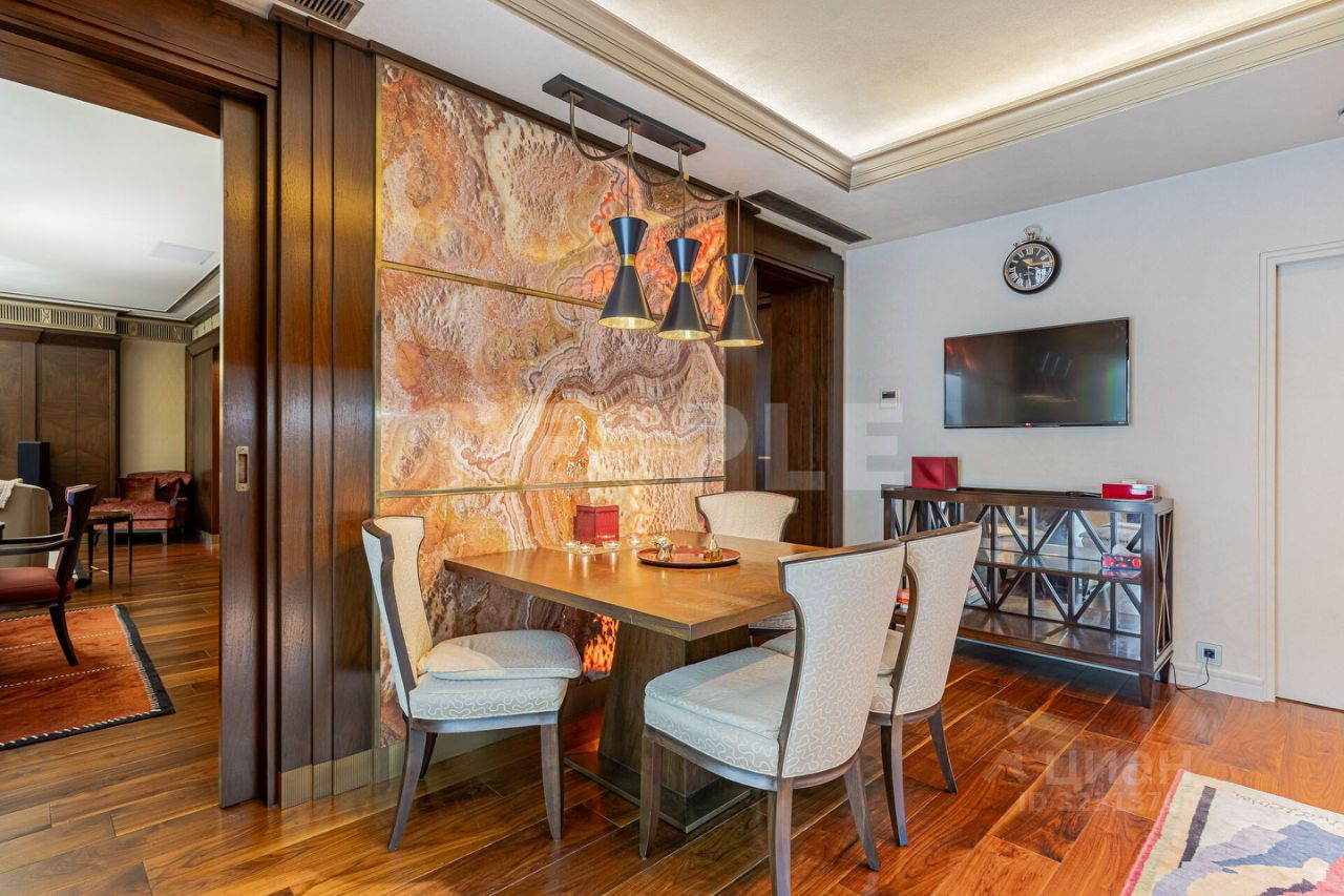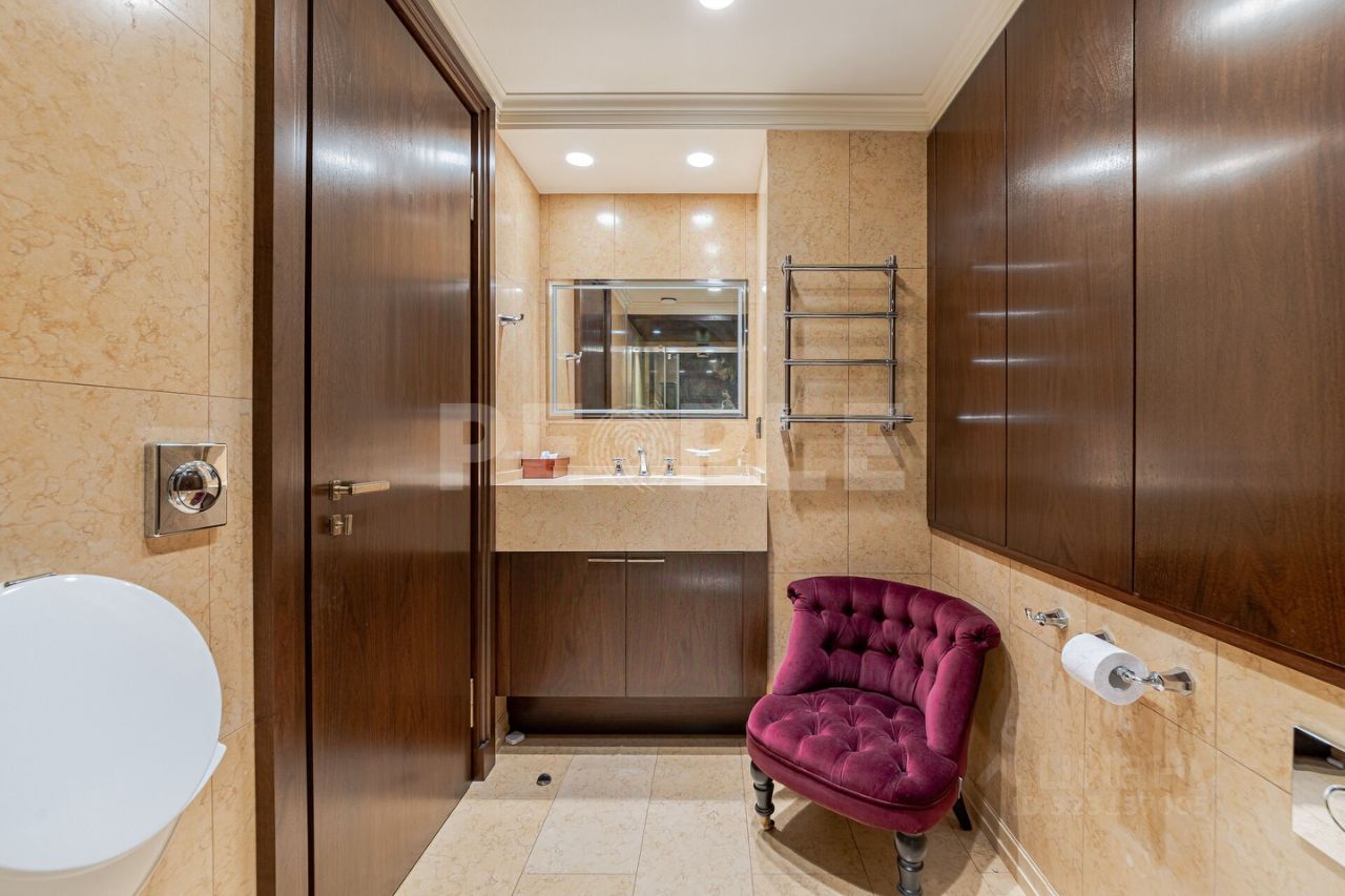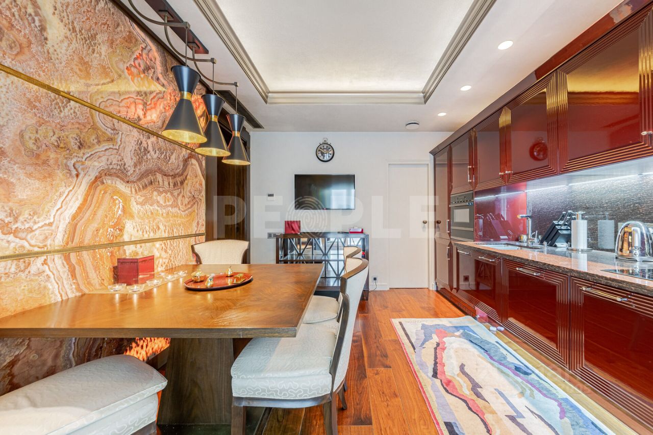 Дизайн квартиры выполнен в стиле Ар-деко по авторскому проекту от известного дизайнерского бюро Самыгин и Самыгин. Отделка с использованием самых дорогих натуральных материалов. Дубовый паркет, стеновые деревянные панели, мрамор, оникс.