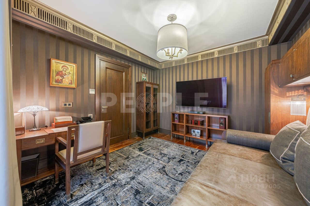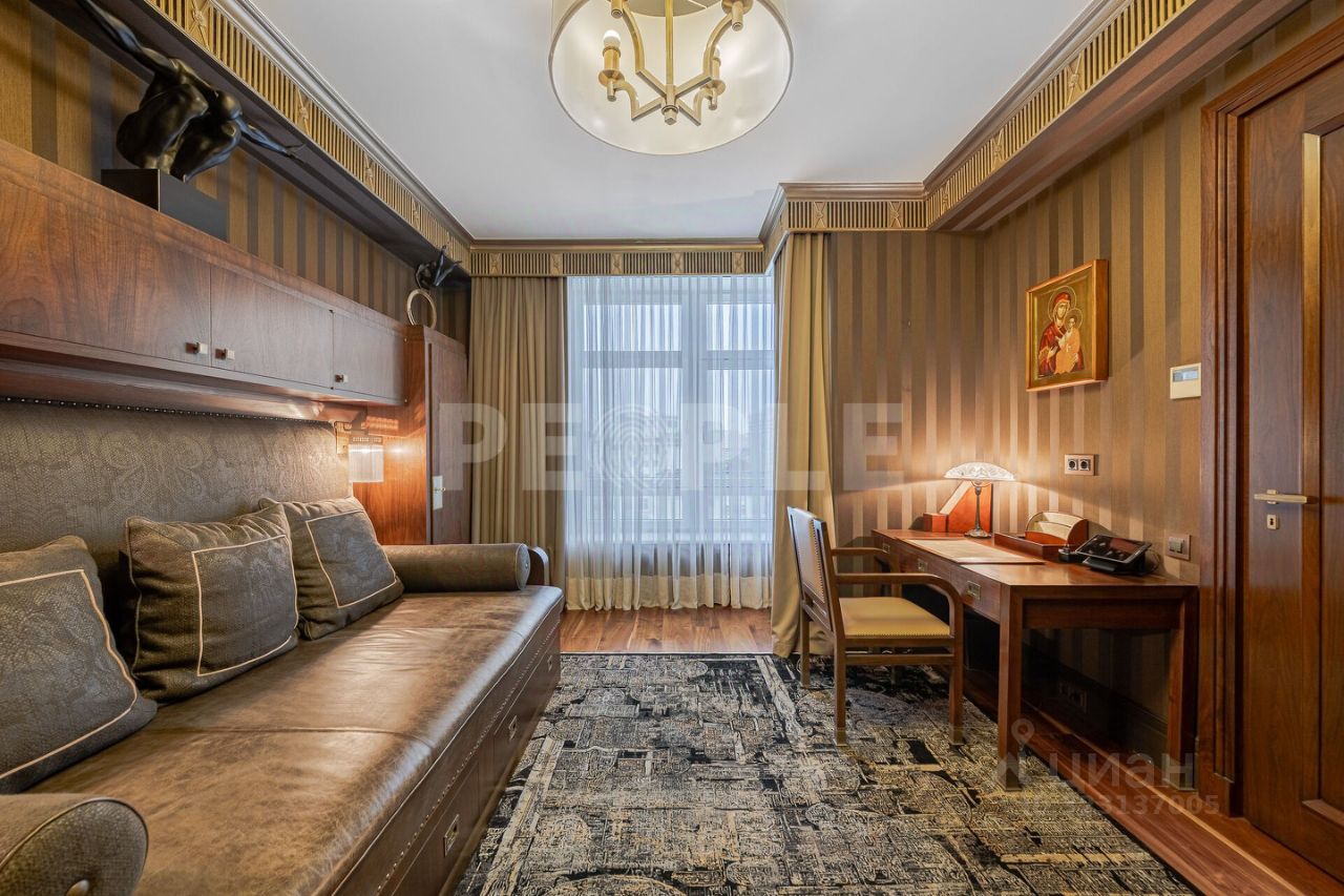В гостиной мебель Barbara Barry. В кабинете мебель от бюро Самыгин на заказ. Обивка дивана выполнена в мастерской Сергея Коровкина. Свет в квартире от ведущих брендов Baker,Visual Comfort. Текстиль - James Hare. Ковёр - ателье Марка Патлиса. Безусловное преимущество - скрытая система приточно-вытяжной вентиляции и кондиционирования.