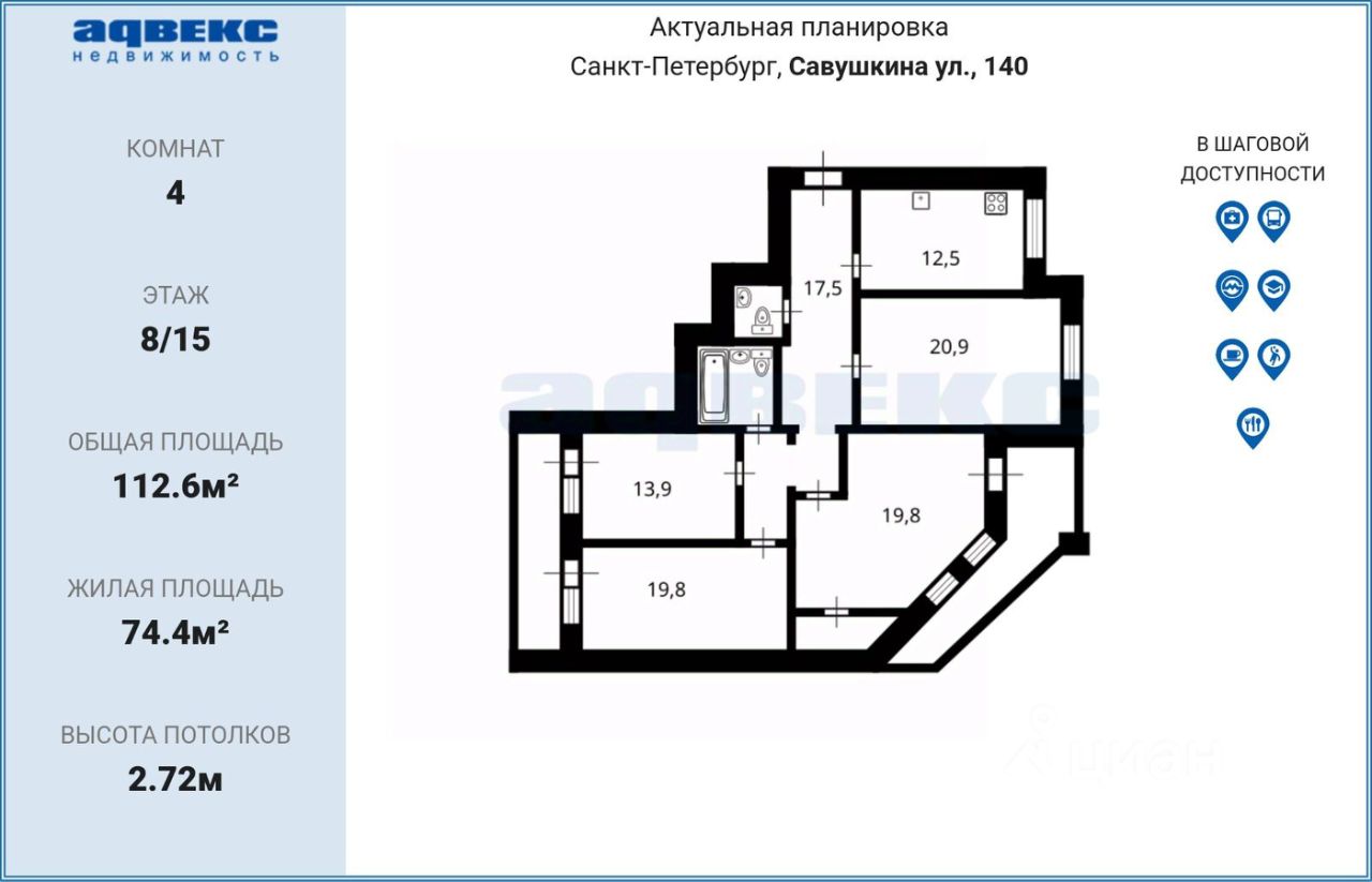 продам 4-к, Савушкина, 14037 700 000 ₽