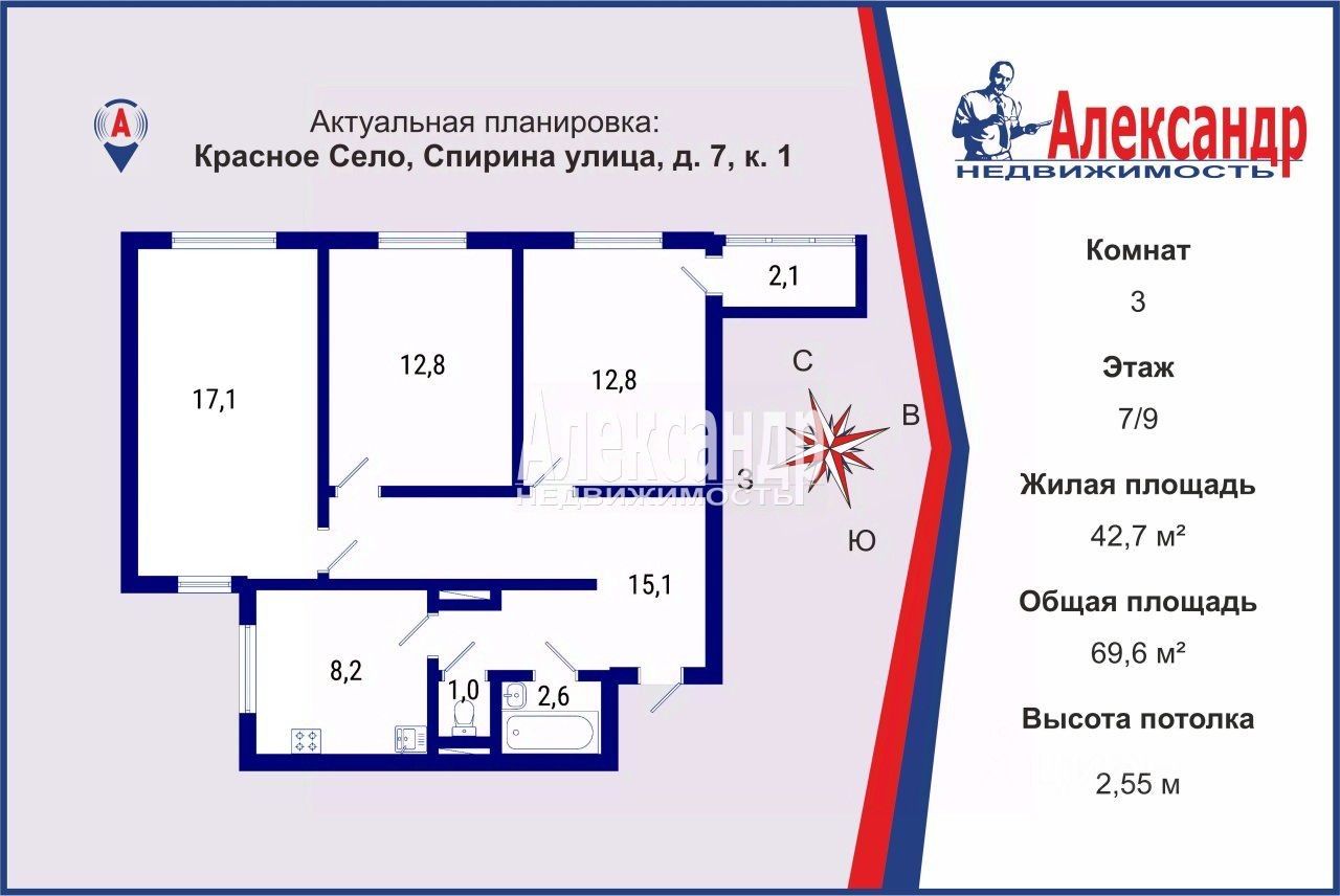 1704729 Продаётся просторная трёхкомнатная квартира по адресу Санкт-Петербург, город Красное село, ул. Спирина д.7, кор.1, литера А, общей площадью 69,6 кв. м., жилой площадью 42,7 кв. м. Комнаты раздельные, большая комната размером 17,1 кв. м., две другие комнаты по 12,8 кв. м., окна выходят на улицу. Санузел раздельный, кухня 8,2 кв. м., коридор 15,1 кв. м., в квартире сделан косметический ремонт. Все комнаты светлые и просторные, что создаёт приятную атмосферу для проживания. В квартире есть один балкон, где можно насладиться свежим воздухом и видом на окрестности. Квартира расположена на седьмом этаже десятиэтажного дома. Дом 2009 года постройки, в подъездах чистота и порядок, соседи добрые, вежливые. Инфраструктура района отлично развита: рядом с домом остановка общественного транспорта, можно добраться до станций метро Проспект Ветеранов, Московская и ж/д станции. В шаговой доступности взрослая и детская поликлиника, МФЦ, школа, д/сад, магазины, кафе, аптеки, банки и т.д. Прямая продажа. Гарантирую безопасную сделку и юридическую поддержку своим клиентам. Если есть вопросы, звоните. Нет вопросов, записывайтесь на просмотр.