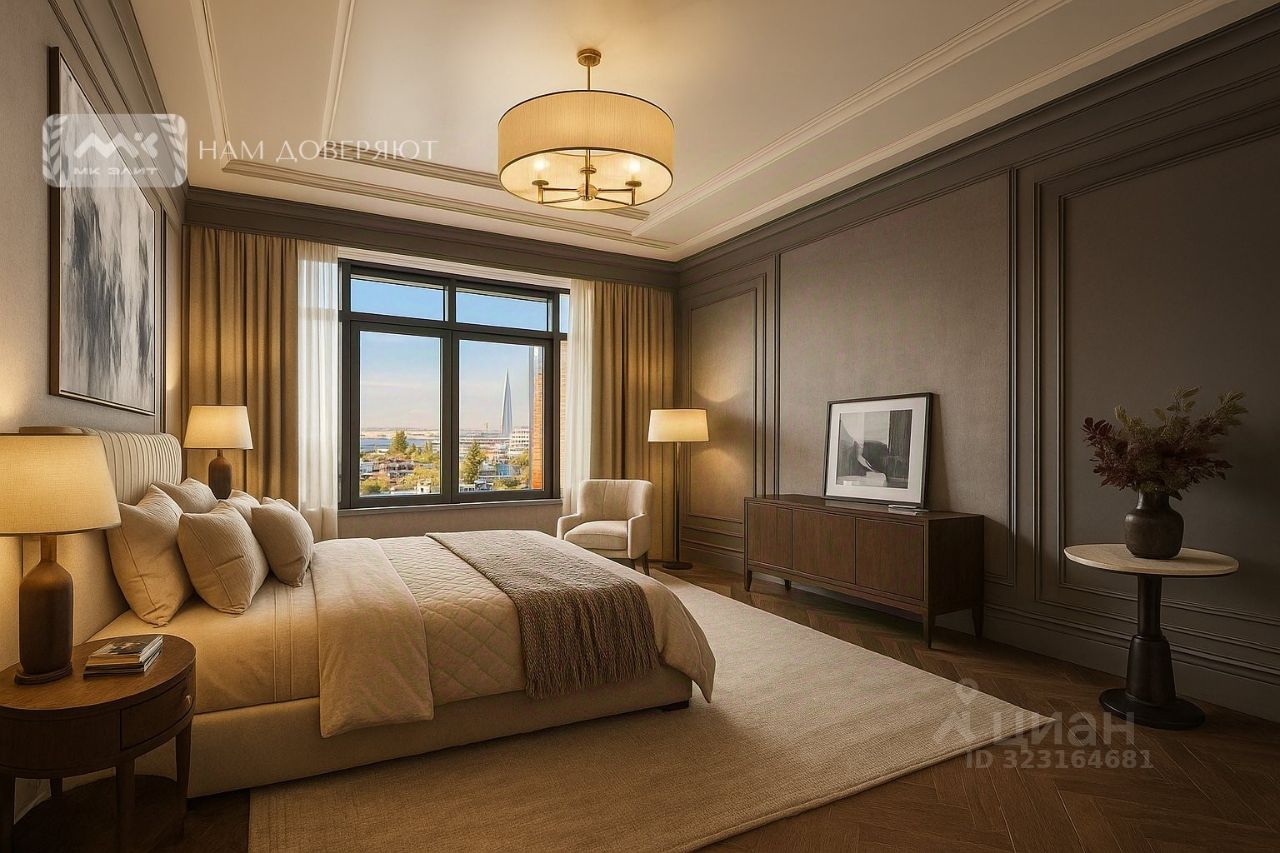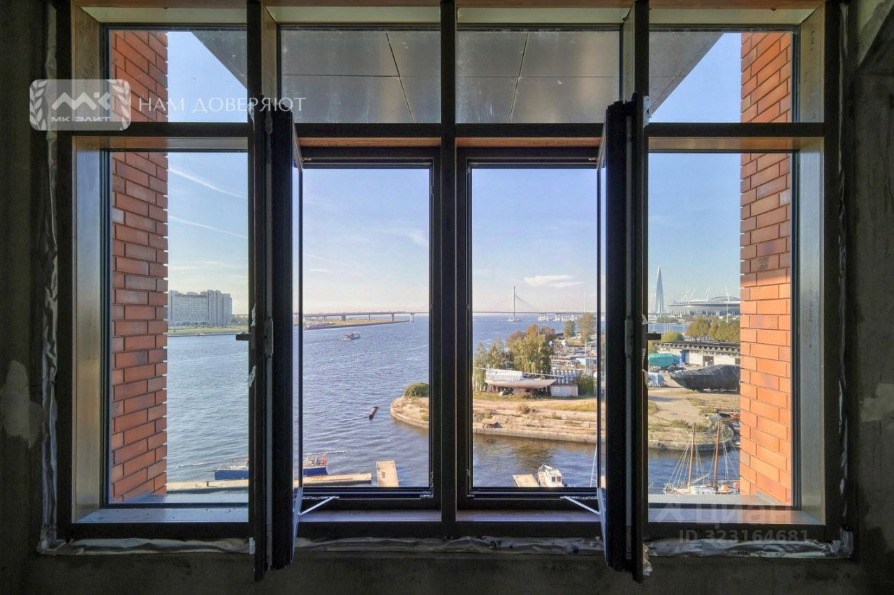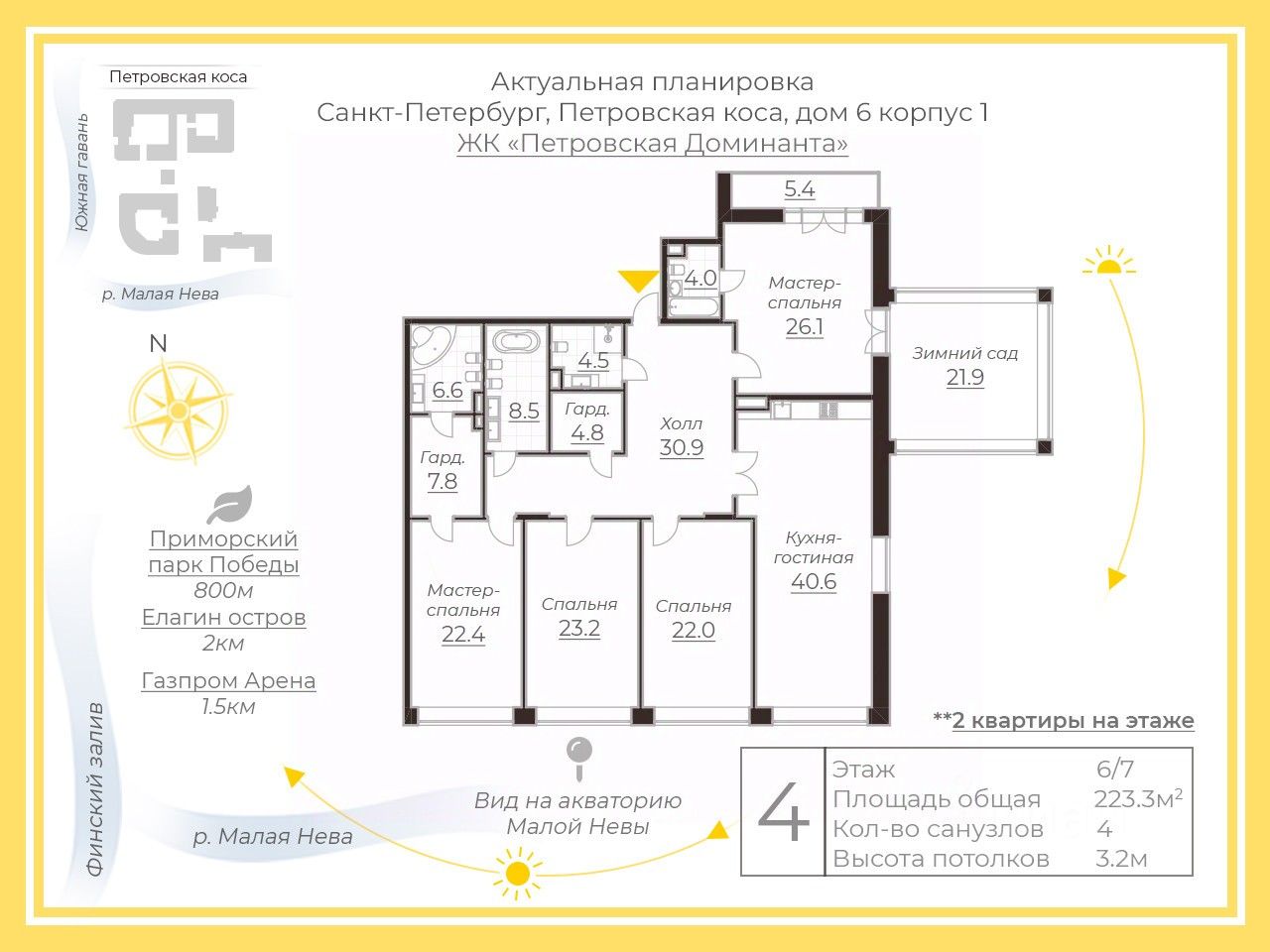 О квартире : Площадь: 223.3 м². Планировка: 4 изолированные комнаты: две мастер-спальни, детская, кабинет и просторная кухня-гостиная. • изюминка квартиры-потрясающий зимний сад Виды из окон: Панорамные виды на акваторию Финского залива, яхтенные причалы и Лахта Центр. Романтичные рассветы и закаты доступны вам 24/7.