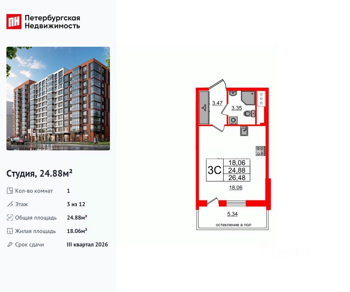 Удобная, классическая, функциональная европланировка, просторная прихожая 3.47 м². Общая площадь студии - 24.88 м², жилая 18.06 м², высота потолка 2.77 м.
