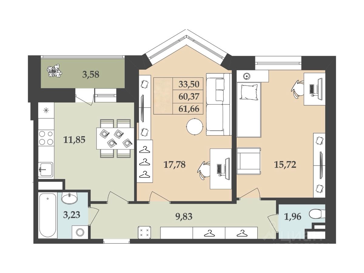 Продается просторная 2-комнатная квартира в новом доме, расположенная по адресу Ленинградская область, Кингисепп, переулок Юности, 4. Общая площадь квартиры составляет 62.3 кв. м, жилая площадь — 33.7 кв. м, кухня — 11.8 кв. м. Квартира находится на 2 этаже 9-этажного дома, построенного в 2025 году. Высота потолков — 2.8 метра, что придает ощущение простора. Окна выходят на улицу, в квартире есть одна просторная лоджия.