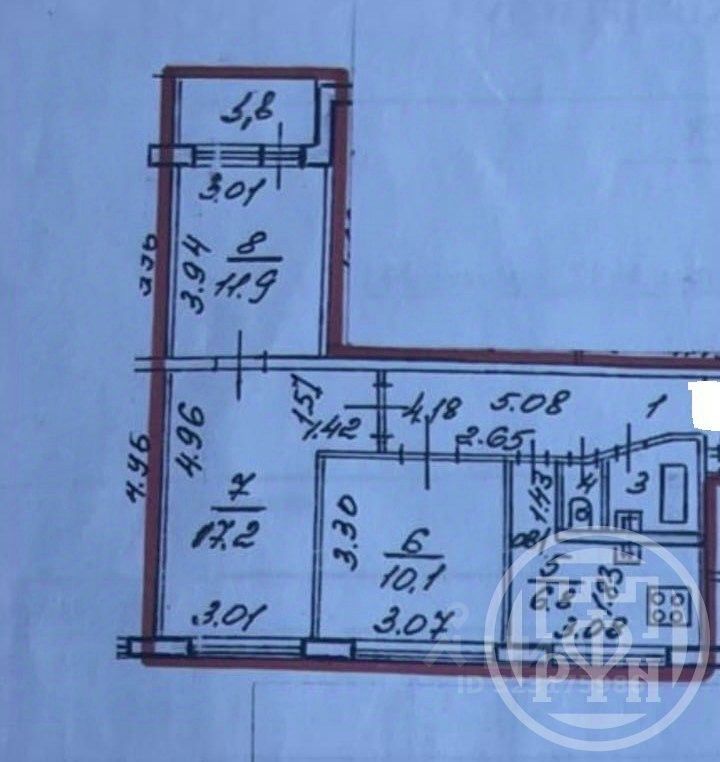Три просторные комнаты, жилая 10,1+17,2+11,9 кв.м. с одной комнаты застеклённая лоджия. Кухня 6,8 кв.м., санузел раздельный.