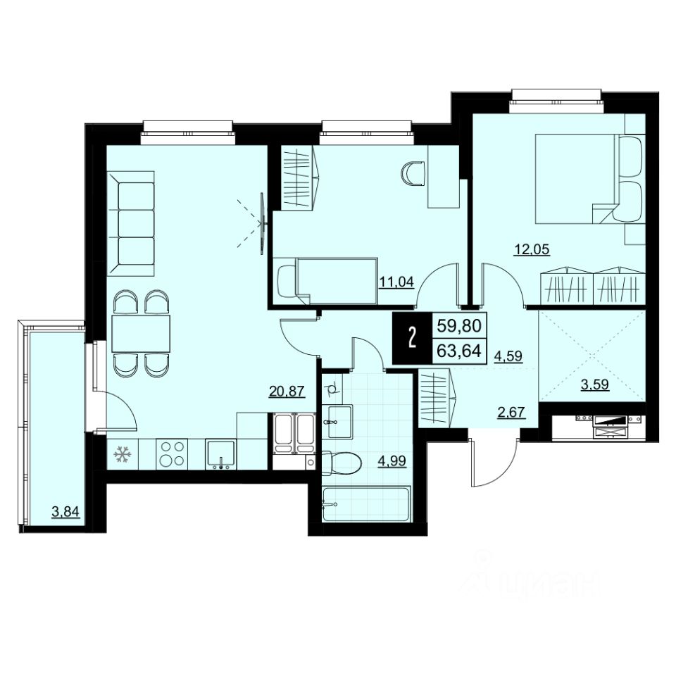 Просторная кухня-гостиная, просторный коридор, изолированные спальни, просторная гардеробная и много систем хранения, окна на две стороны, вид во двор без машин, гостиная-трансформер, выход на лоджию, продуманная планировка прихожей и коридора. Практичная планировка в двухкомнатной квартире площадью 62,86 м² в современном макрорайоне АМГРАД: кухня-гостиная 20,09 м² объединяет пространство для отдыха, работы и приема гостей, откуда есть выход на глубокую лоджию. В двух изолированных комнатах площадью 11,04 и 12,05 м² есть место для шкафов, рабочей зоны и прикроватных тумб. Практичность: гардеробная и системы хранения позволяют поддерживать порядок, совмещенный санузел с местом для стиральной машины и дополнительных систем хранения.