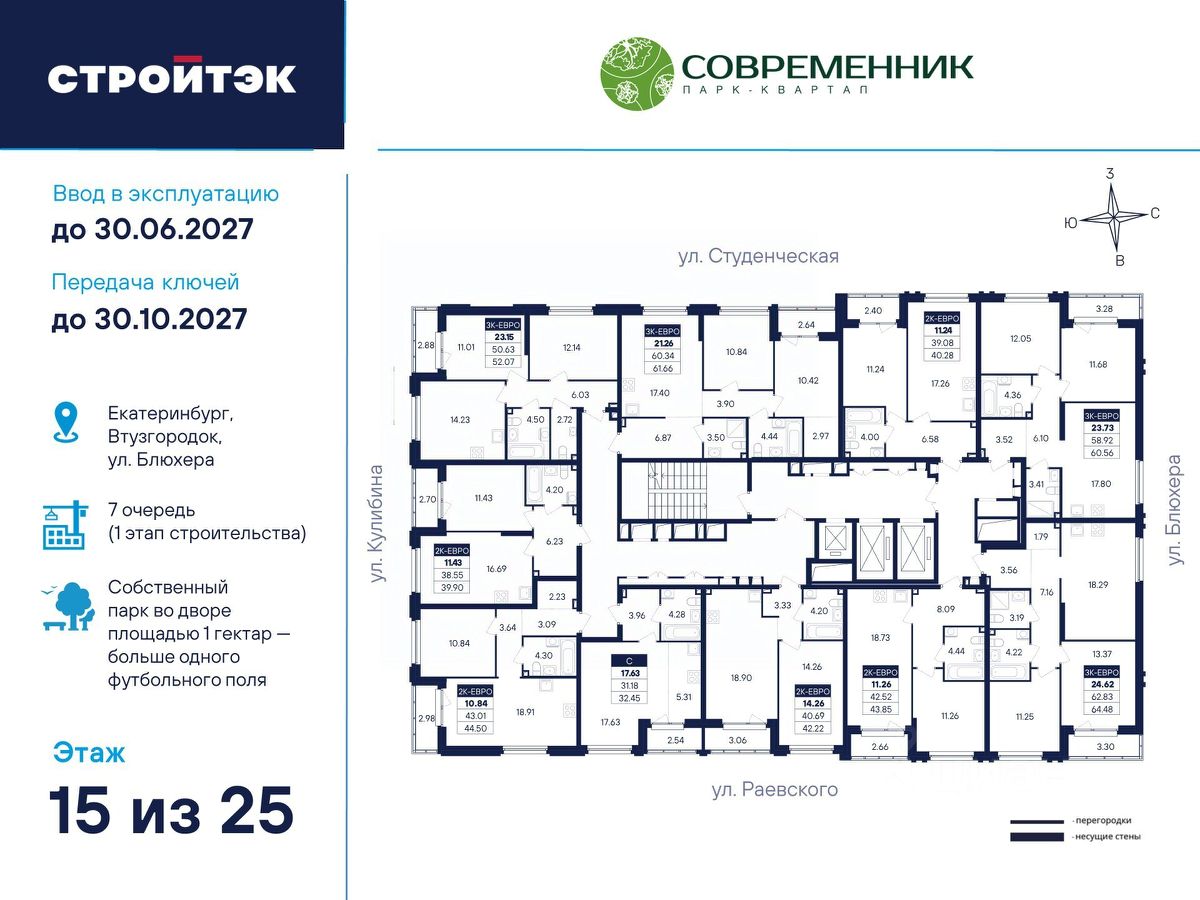 Время жить счастливо Современник — знаковый парк-квартал в интеллигентном районе Втузгородок, откуда недалеко до центра, а вблизи ведущие вузы и театры. Квартал состоит из 8 очередей строительства. Шесть очередей уже сданы и заселены, седьмая строится. В продаже квартиры от застройщика: 1 этап седьмой очереди. Объединяет квартал большой внутренний парк площадью в гектар — богатый прогулочными маршрутами, тенистыми деревьями, пространствами для отдыха, спорта и детских игр. С внешней стороны, у домов седьмой очереди, появится гостевой центр. Проект создавали в KCAP Architects and Planners, архитектурном бюро из Нидерландов, чьи работы украшают ландшафты Гамбурга, Антверпена и других городов Европы. Технологии, продуманное пространство и трендовый облик зданий создают размеренную атмосферу для жизни здесь. Достойное окружение До проспекта Ленина на машине вы доберётесь за 10 минут, а с другой стороны, неподалёку — Шарташский лесопарк с озером Шарташ, которому около миллиона лет. Здесь для вас пляжи, лодочные станции, тропы для бега и кафе. В квартале уже работают супермаркеты, пекарни, салон красоты и не только. Ближние школы, гимназии и университеты помогут расправить крылья новым поколениям, а детские сады станут заботливой средой в начале пути. Кстати, на территории квартала спроектирован муниципальный детский сад на 200 мест. Выходите во двор Гуляйте по зелёным аллеям или устройтесь с книгой в гамаке. Займитесь воркаутом, футболом, баскетболом или пинг-понгом. Проводите семейные праздники под крытым амфитеатром или отправьте детей играть на насыщенный плейхаб. Мы всё предусмотрели. На закрытой территории без машин и посторонних спокойно и безопасно. Видеонаблюдение и освещение добавляют ещё больше уверенности. Впечатляющая доминанта у домов 7 очереди — новый гостевой центр: камерное пространство под навесом-перголой с озеленением и скамейками, чтобы встречать друзей. Ваша зона комфорта Стильное лобби Современника мы выполним в эстетике contemporary: минимализм, сочетание дерева со штукатуркой и тёмным металлом, зеркала, витражи. Обстановка из мягкой мебели, растений и книг. Двери из холла выходят на обе стороны. Внутри — комната для колясок и самокатов. На -1 этаже подземный паркинг с 201 машино-местом, куда легко попасть на лифте прямо с вашего этажа. Здесь же можно приобрести одну из 67 кладовых, чтобы хранить сезонный инвентарь. СТРОЙТЭК возводит 7 очередь в 3 этапа. Дом с привилегиями Первый этап — секция 7.1, башня в 25 этажей. Здесь 246 квартир в 19 уникальных планировках от студий до 3-комнатных, в классических и евро-вариантах. Просторные кухни-гостиные, гардеробные и окна на 2 стороны — лишь часть их плюсов. В Современнике улучшенный стандарт отделки ''Комфорт +''. Помимо комфортных сантехники и электрики, в него входят оконные стёкла Energy Light, которые помогают сохранять температуру, прочный ламинат 33 класса и устойчивые к многократной покраске виниловые обои. Белые межкомнатные двери и плинтусы подчеркнут любую цветовую гамму.