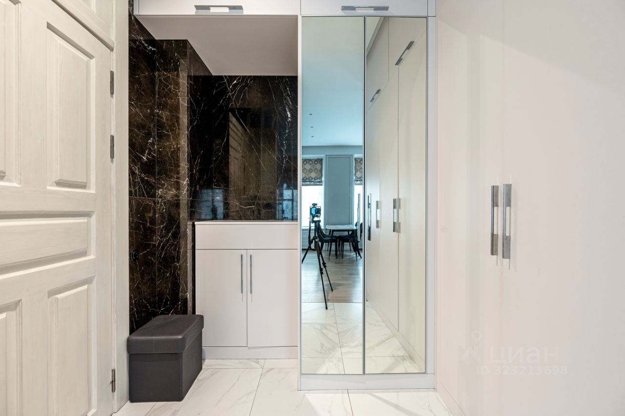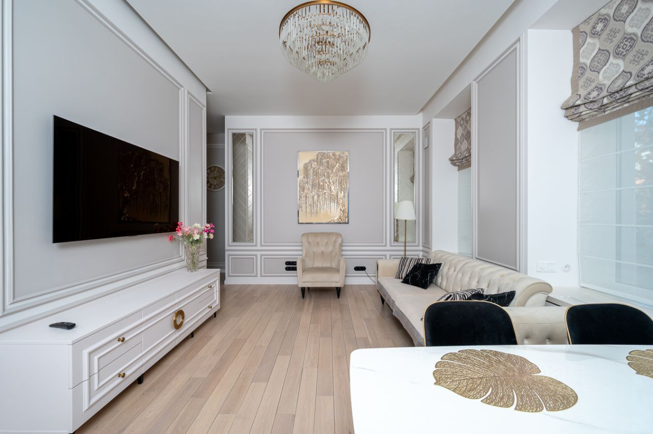 Роскошная отделка и техника. Интерьер квартиры продуман до мелочей: -стены частично отделаны натуральной мраморной плитой толщиной 3 см, -в санузле — изысканная венецианская штукатурка, -обои от Roberto Cavalli придают пространству элегантность, -мебель в гостиной и спальне от Кардинал изготовлена на заказ, -кабинет укомплектован мебелью от Ангстрем, также выполненной по индивидуальному проекту, -мягкая мебель в гостиной — от турецкого производителя Weltew.