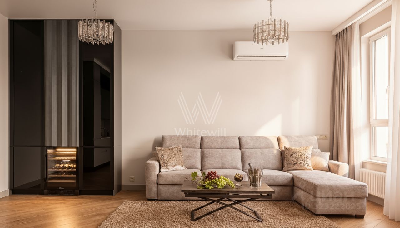 Квартира укомплектована новой мебелью, установлена угловая кухня. Бытовая техника Bosch, холодильник Liebherr, винный шкаф Meyvel Belissimo. Система кондиционирования, посудомоечная машина. Стиральная и сушильная машины Asko. Из окон открываются панорамные виды на город в сторону реки.