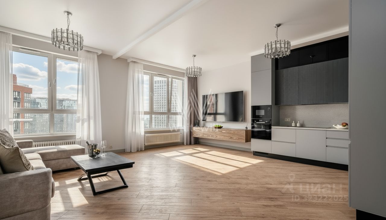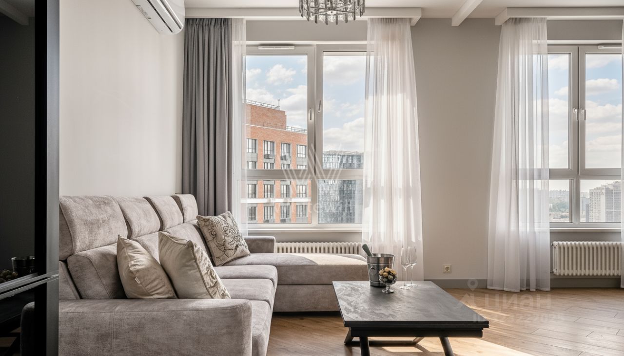 Видовая квартира с двумя спальнями общей площадью 100 м² в комплексе ''Сердце столицы'' на набережной Москвы-реки. Bнтерьер оформлен в современном стиле, большие окна, много естественного света. Спланирована просторная кухня-гостиная, спальня со своей гардеробной, вторая спальня, ванная комната, холл.