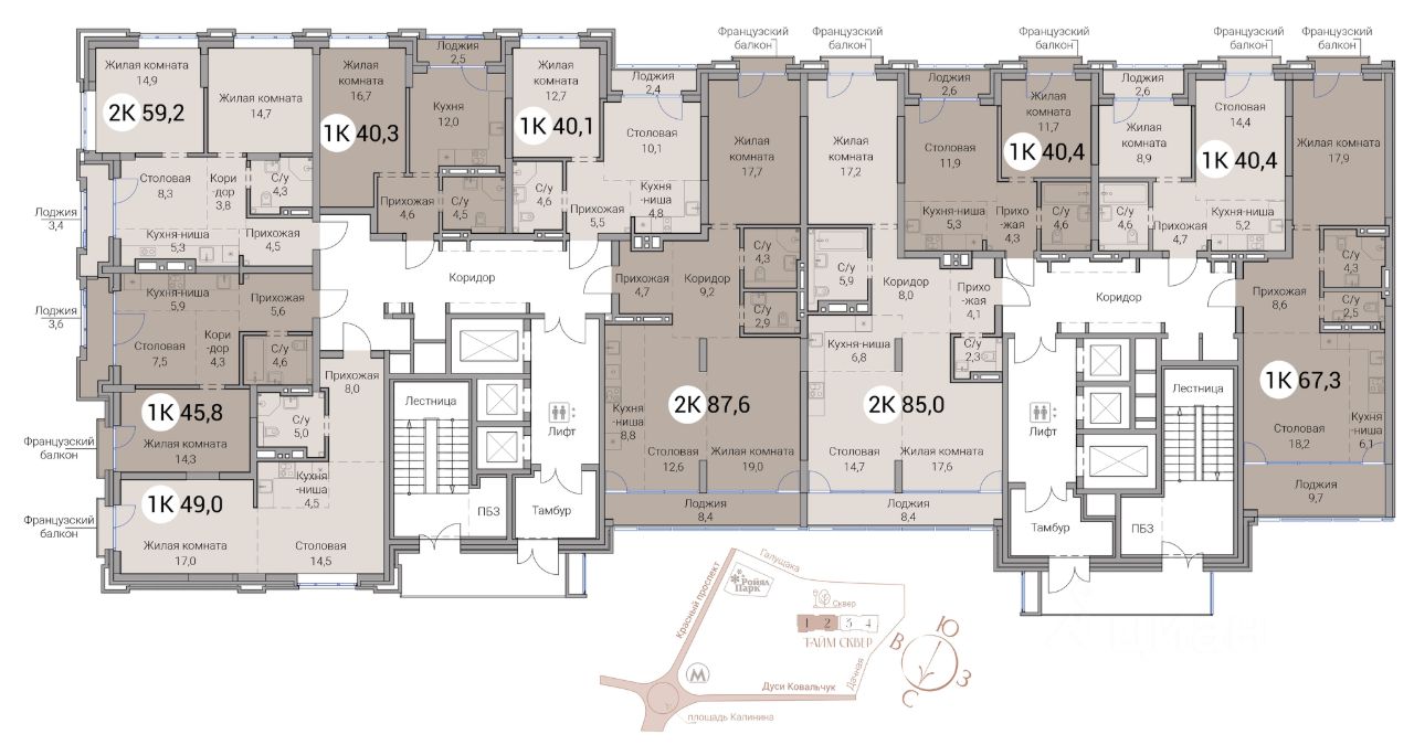 ЖК ''Тайм Сквер'' отличается многообразием планировочных решений: здесь можно выбрать резиденции площадью от 40 до 157 кв.м, в том числе резиденции с террасами, видовые резиденции и двухуровневые хайфлэты с высотой потолков 6 м. Инфраструктура Удобная локация в прямом доступе к центральной части города предоставляет жителям ''Тайм Сквер'' множество возможностей для комфортной жизни. Рядом находятся лучшие образовательные, культурные, медицинские и деловые заведения города, парки, множество детских спортивных и развивающих центров. В пешей доступности: • 5 минут до станций метро Заельцовская, Гагаринская • 5-7 минут до гимназии 9, частной школы ''Аврора'', школы 120, школы ''Журавушка'' • 2-5 минут до государственных и частных детских садов • 1 минута до ТРЦ Ройял Парк • 3 минуты до супермаркета ''Бахетле'' • 15 минут до зоопарка и дендропарка