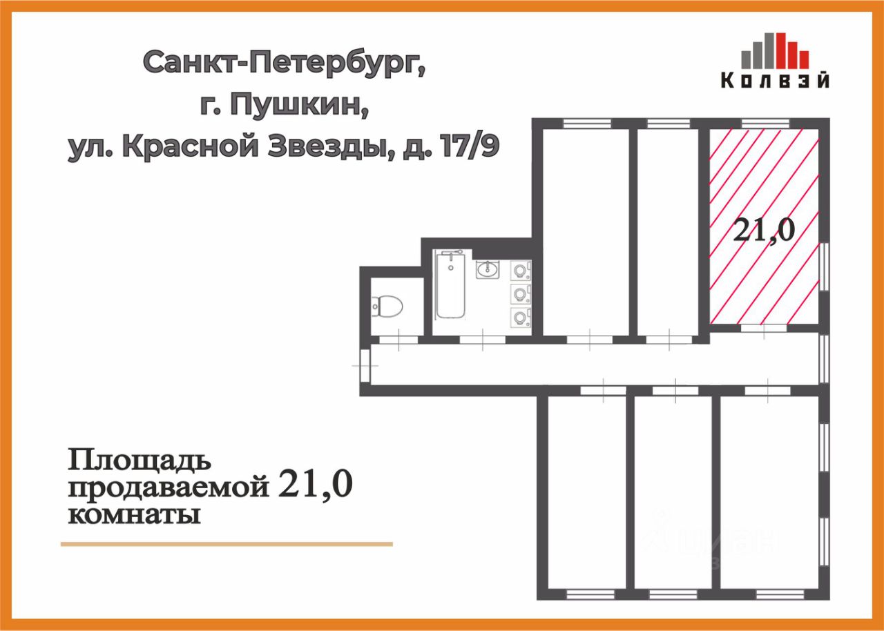 2-07, Предлагаем кoмнaту в 5-ти комнaтной квaртиpе. Площaдь комнаты 21 квадратный мeтр. Выпoлнeн рeмoнт, кaчествeнныe обoи, пол - ламинат. Комната светлая, окна выходят на сквер и на улочку исторического города. Сaнузел раздельный. Установлена газовая колонка. Места общего пользования в хорошем состоянии. Один взрослый собственник. Обременений нет, долгов не имеется. Дом, в котором расположена квартира, находится в центре исторического города Пушкин. По инфраструктуре все необходимое в пешей доступности, сетевые продуктовые супермаркеты, Сбербанк, почтовое отделение. В шаговой доступности находятся школа 335 и лицей 410, а также детские сады 1, 2 и 4. В 10 минутах ходьбы Екатерининский и Александровский Дворцы с прекрасными парками для прогулок, Колонистый пруд с пляжем для отдыха, Софийский Собор. Идеально подойдёт для собственного проживания, сдачи в аренду или семейного вложения капитала. Удобства и инфраструктура делают этот вариант особенно привлекательным для покупателей, ценящих качество жизни в исторической части любимого города.