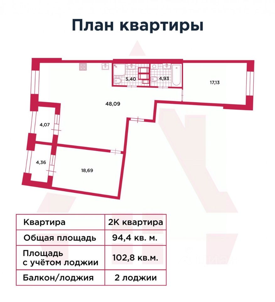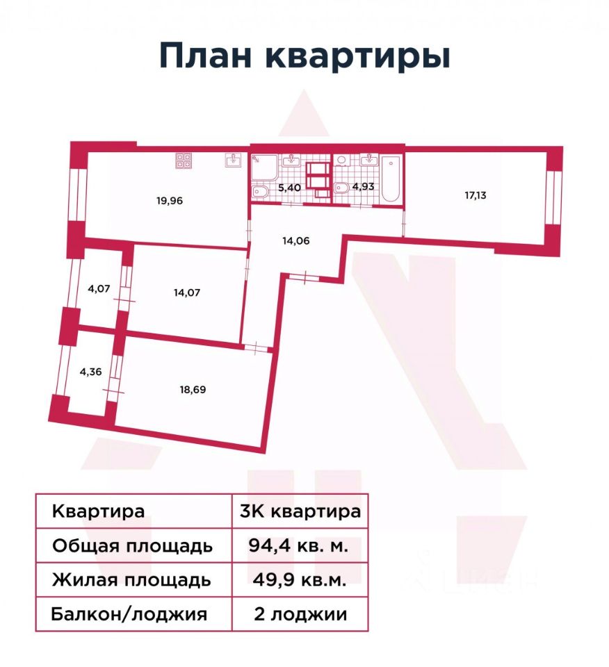 • Площадь: 94,4 м² • Лоджии: 2 • Этаж: 5 • Планировка: Возможность объединить кухню с гостиной для создания просторной зоны для встреч и отдыха, оставив две приватные спальни. • Окна: Высокие, много света и воздуха.