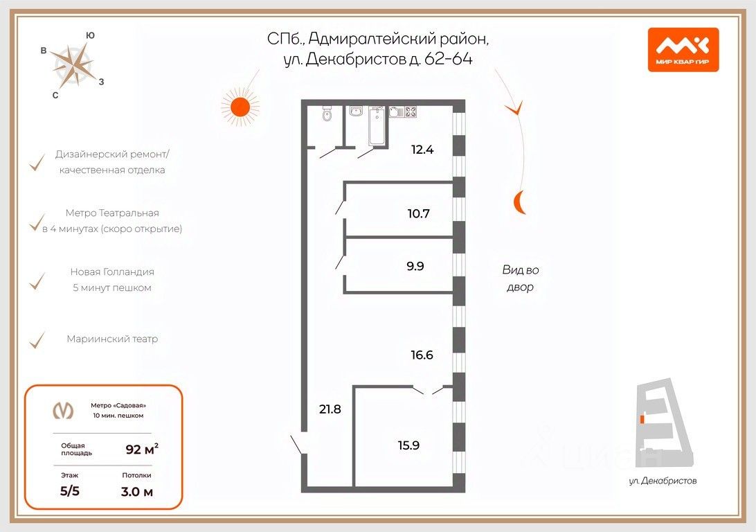 Квартира солнечная, большие окна, которые выходят в тихий двор. Вид на крыши нашего прекрасного Петербурга! 3 комнаты изолированы, просторная кухня -12.5 м. и большая гостиная, готовая к принятию новых жильцов! раздельный санузел. Квартира расположена на 5м этаже БЕЗ лифта!