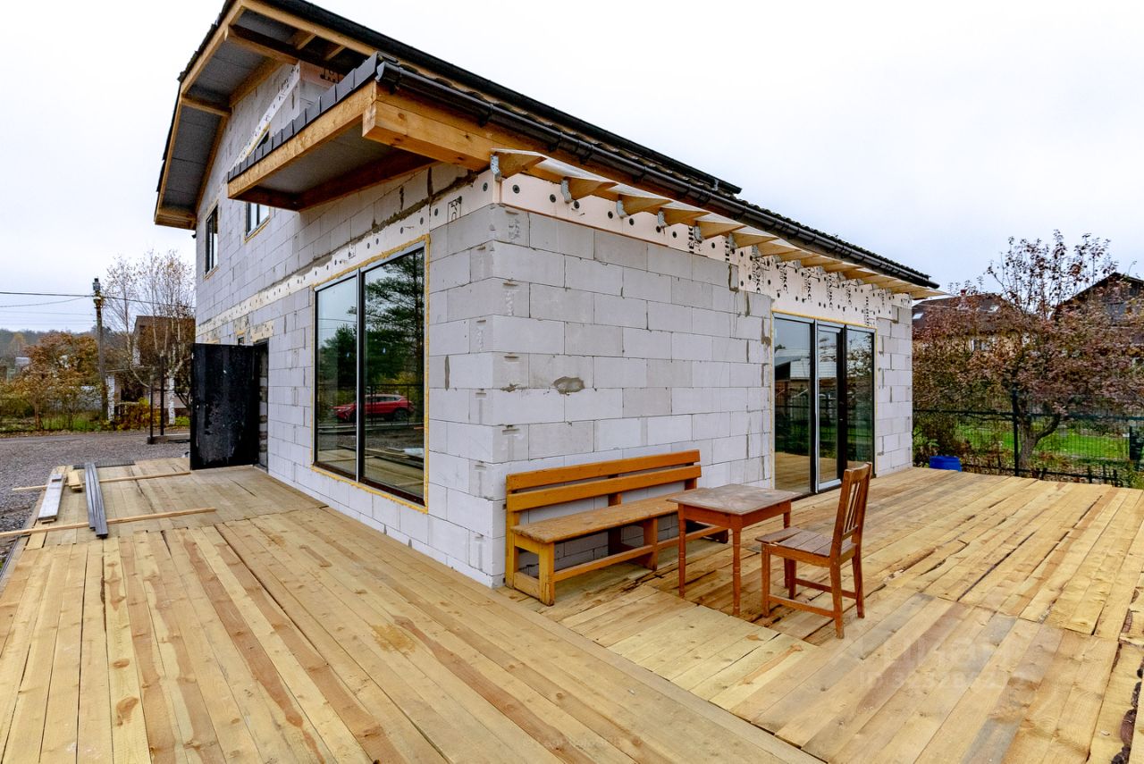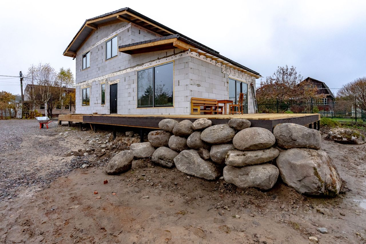 - кухня-гостиная 32,2 м2 с выходом на крытую террасу 8.1/4-32 м2 и открытую 2,5/8-20 м2 (сделан каркас на сваях)