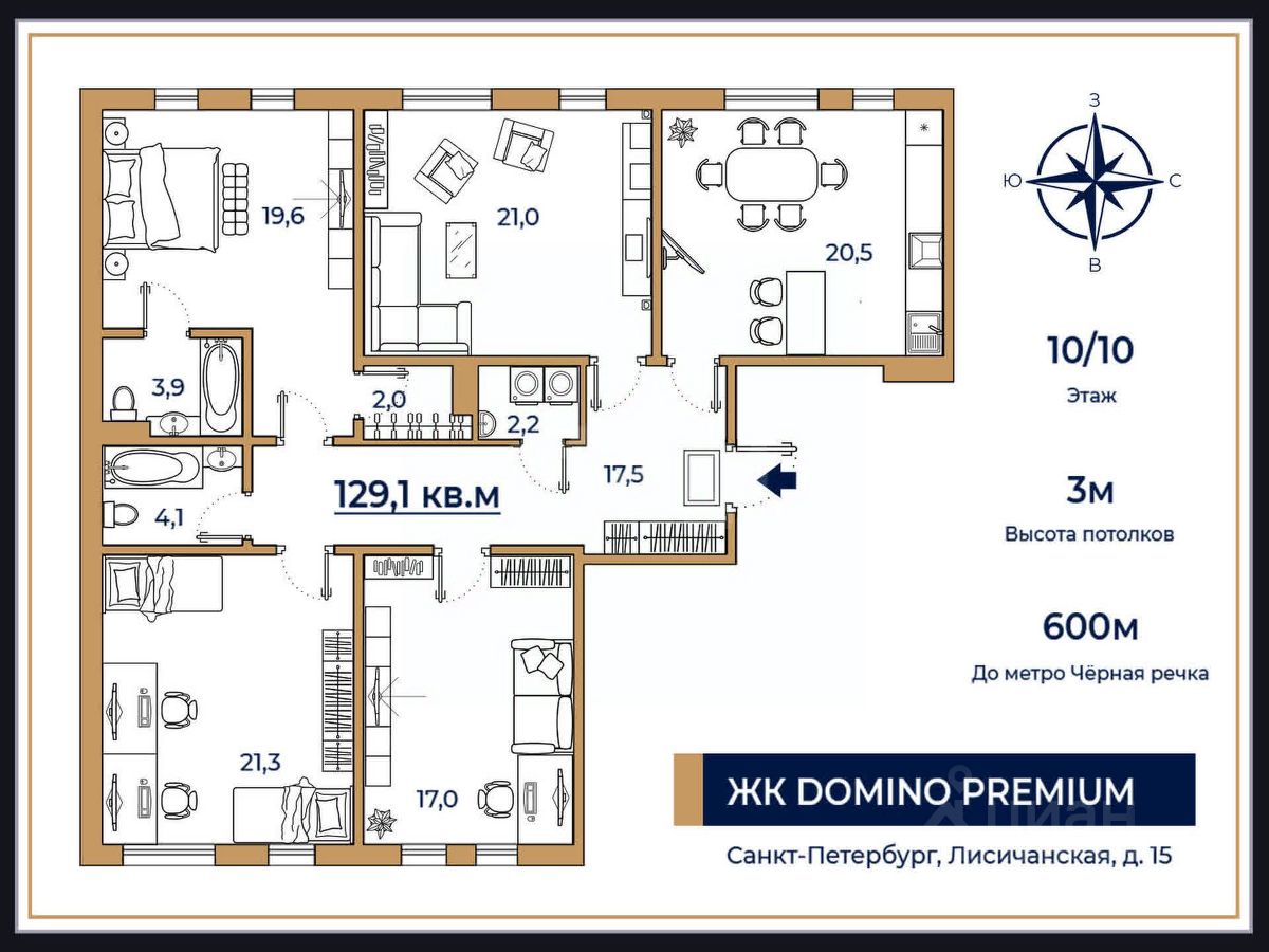 Просторная 4-комнатная квартира без отделки в жилом комплексе бизнес-класса DOMINO Premium.