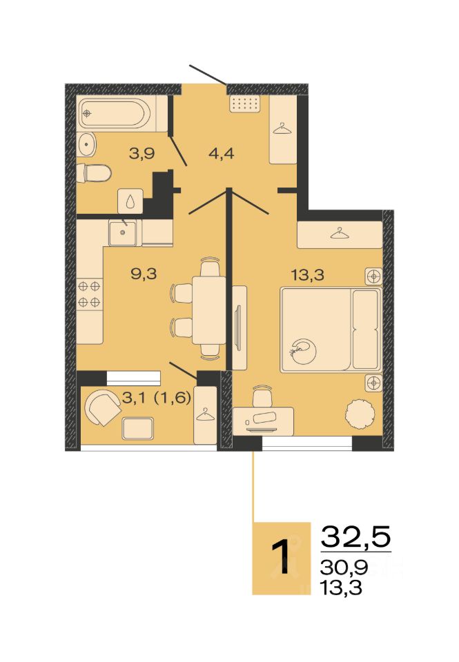Общая площадь32,5 м2