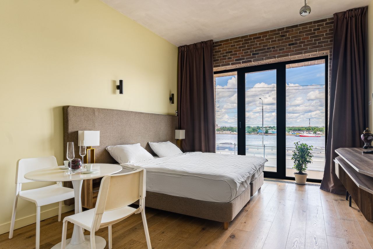 ! Видовой апартамент - студия в знаменитом лофт-квартале Docklands с видом из панорамных окон на Неву, стадион и Лахту, укомплектованный всей мебелью и техникой для комфортного проживания. Заезжай и живи!