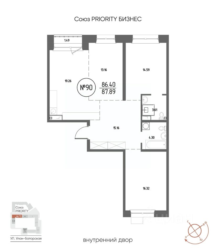 Продаётся 3-комнатная квартира в строящемся доме (Дом 4), срок сдачи: III-кв. 2029, общей площадью 87.89 кв.м., на 6 этаже. Мы начали с эталона - жилого комплекса Союз Priority, лучшего в России. А теперь представляем его логичное и яркое продолжение Союз Priority MAX.
