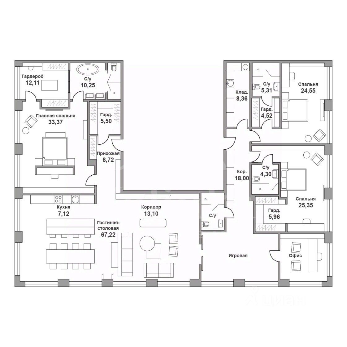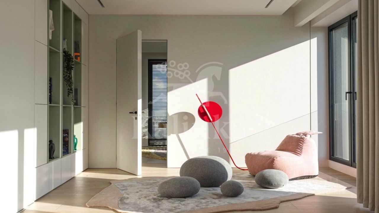 Площадь 287 кв. м разделена на две зоны с индивидуальными входами. Детская зона включает две детские спальни, в каждой из которых есть санузел и вместительная гардеробная, светлая и просторная игровая комната, которую можно использовать как дополнительную спальню, а также комнату для занятий. Вторая зона — это мастер-спальня с большой гардеробной и собственным санузлом, а также великолепная стильная гостиная, гармонично объединенная с кухней и столовой. В квартире реализована самая современная инженерия, включая систему приточно-вытяжной вентиляции с забором и фильтрацией воздуха, а также центральную систему кондиционирования с увлажнением.