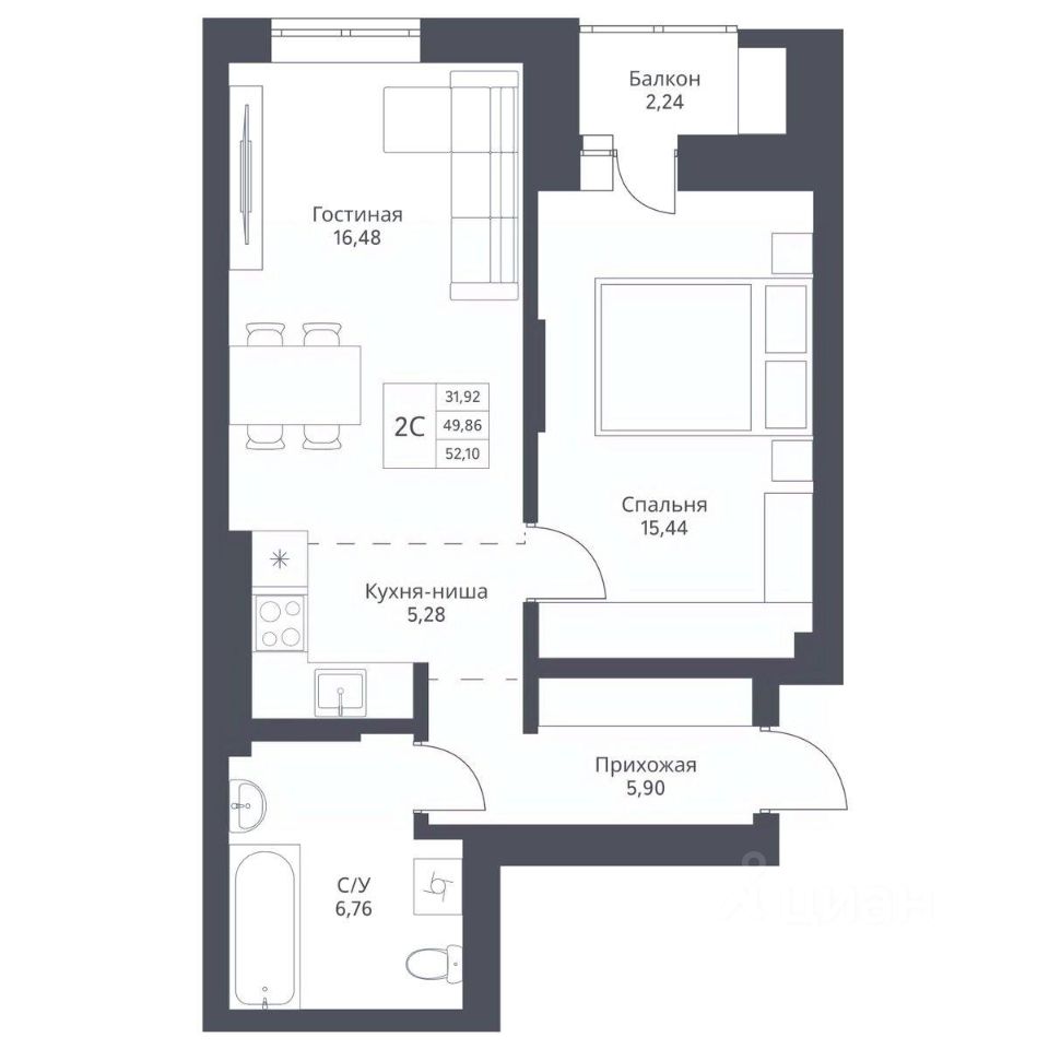 Общая площадь52,1 м2