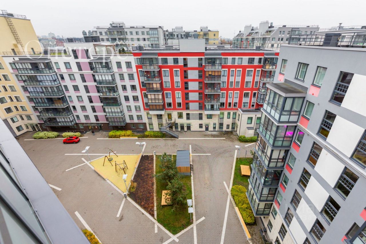 Из двух спален открывается вид во двор, из третьей спальни (она же кабинет) — на проспект Медиков. Из кухни-гостиной есть выход на просторный балкон с видом на крыши и Петропавловскую крепость со шпилем.