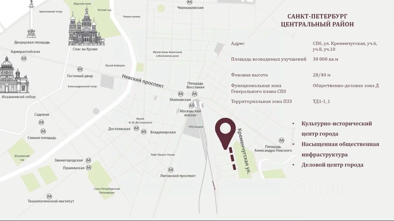 Участок расположен в непосредственной близости от Невского проспекта и Лиговского проспекта. В пешей доступности две станции метрополитена Площадь Восстания и Площадь Александра Невского. Отличная транспортная инфраструктура, высокая пешеходная проходимость. Участок расположен на фасадной линии большого жилого и делового массива на улице Кременчугской. ___________________