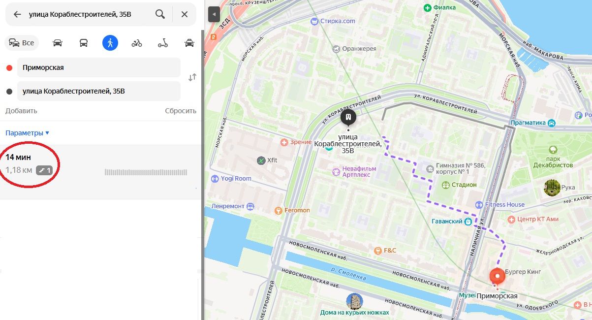 До метро Приморская 14мин. пешком. Развитая инфраструктура: магазины (Пятерочка, Перекресток), детские площадки, детский сад, дом творчества во дворе.