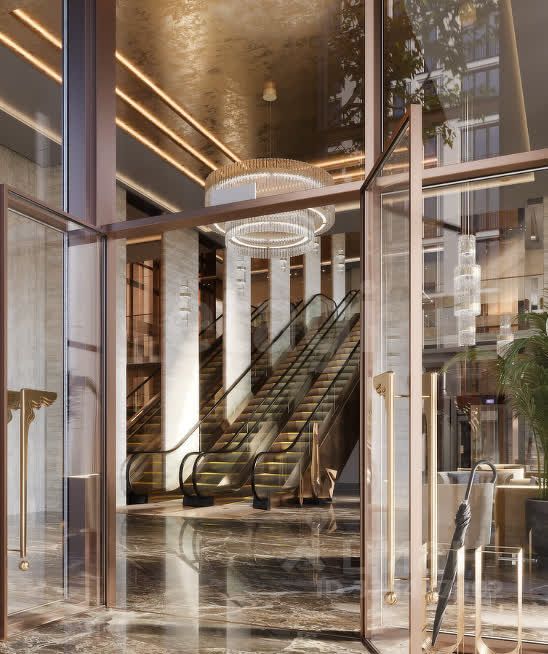Внутренняя инфраструктура комплекса включает фитнес-клуб с бассейном непосредственно в нашем корпусе, доступ к которому осуществляется через подземный паркинг. Входные группы выполнены в стиле арт-деко с отделкой премиум-материалами и высотой потолков 8,5 м. Панорамные лифты в прозрачных шахтах, центральное кондиционирование. Пешеходные променады, стилизованные под старинные мощеные улицы, подчеркивают статусность жилья.