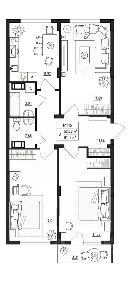 Продаётся 3-комнатная квартира в сданном доме (Сиреневая, 25к1 (Корпус 3)), срок сдачи: IV-кв. 2024, общей площадью 81.12 кв.м., на 2 этаже. В деревне Малое Верево есть все, что нужно для комфортной и спокойной жизни: рядом есть магазины, кафе, детские сады, школы и поликлиники. Ну, и конечно же, парковочные места для машин. А к моменту сдачи торгового центра - всё необходимое будет в шаговой доступности.