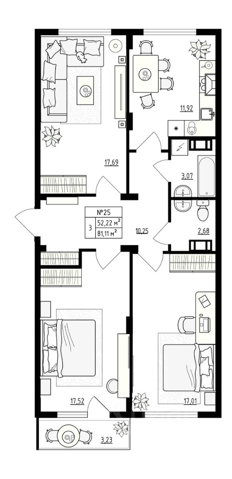 Продаётся 3-комнатная квартира в сданном доме (Сиреневая, 25к1 (Корпус 2)), срок сдачи: IV-кв. 2024, общей площадью 81.11 кв.м., на 3 этаже. В деревне Малое Верево есть все, что нужно для комфортной и спокойной жизни: рядом есть магазины, кафе, детские сады, школы и поликлиники. Ну, и конечно же, парковочные места для машин. А к моменту сдачи торгового центра - всё необходимое будет в шаговой доступности.
