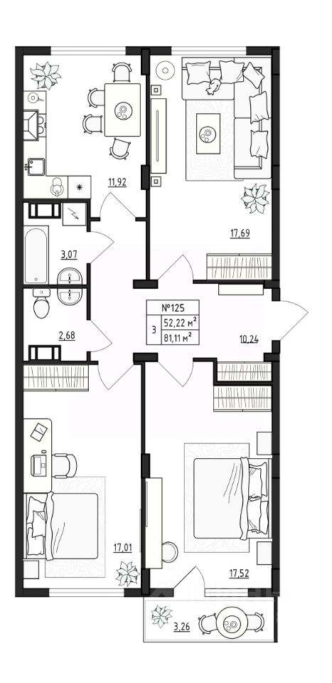 Продаётся 3-комнатная квартира в сданном доме (Сиреневая, 25к1 (Корпус 2)), срок сдачи: IV-кв. 2024, общей площадью 81.11 кв.м., на 3 этаже. В деревне Малое Верево есть все, что нужно для комфортной и спокойной жизни: рядом есть магазины, кафе, детские сады, школы и поликлиники. Ну, и конечно же, парковочные места для машин. А к моменту сдачи торгового центра - всё необходимое будет в шаговой доступности.