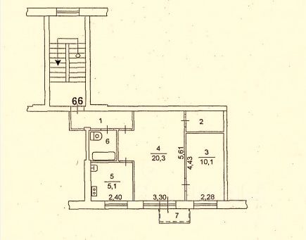 Квартира находится на пятом этаже, что обеспечивает отличный вид из окон на тихий и зелёный двор. Общая площадь составляет 44.9 кв.м., жилая 30.3 кв.м. (20.3+10.1), кухня - 6.3 кв.м.