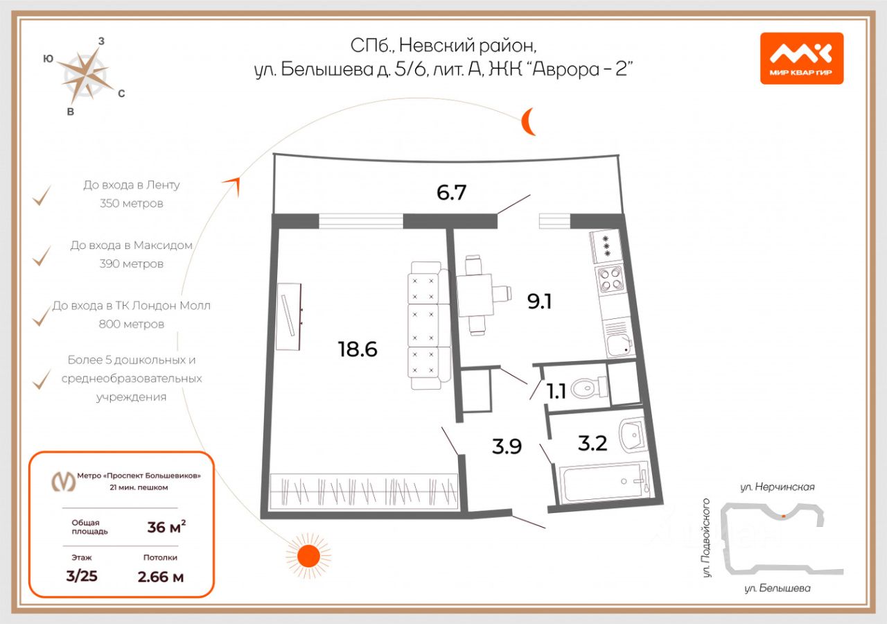 ИНФРАСТРУКТУРА Всё для комфортной жизни — в пешей доступности: Магазины и ТЦ: Максидом — 550 м (6 мин пешком) Лента — 700 м (8 мин пешком) ТРК ''Невский'' — 1 км (12 мин пешком)