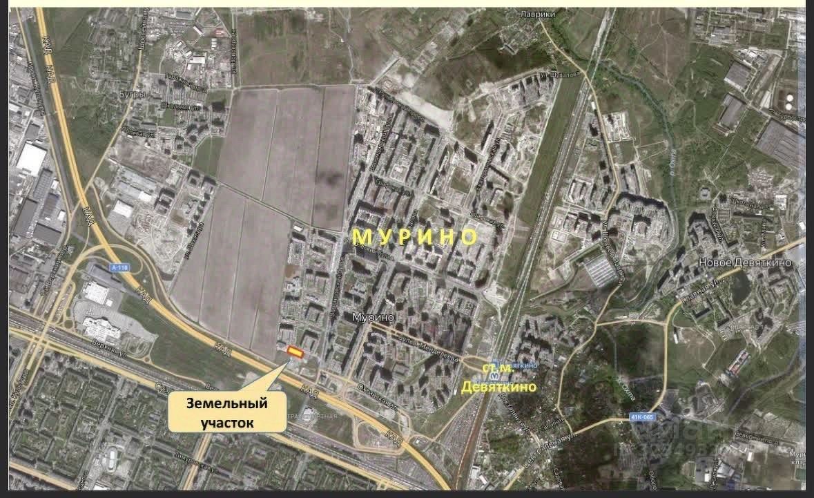 Земельный участок расположен в густонаселенном и динамично развивающемся районе с постоянным населением около 200 000 человек, из которых 70 000 проживают в шаговой доступности. Ключевым преимуществом является его прямое примыкание к сложившимся жилым кварталам без барьеров в виде шумных магистралей, что формирует стабильно высокую проходимость в этой локации. Транспортная доступность обеспечивается близостью станции метро ''Девяткино'' и удобным съездом на Кольцевую автодорогу, которые связывают объект со всеми ключевыми направлениями города. Участок имеет выгодное положение на первой линии проектируемой автомобильной дороги Бугры-Мурино, и открывает значительный потенциал для коммерческого использования.