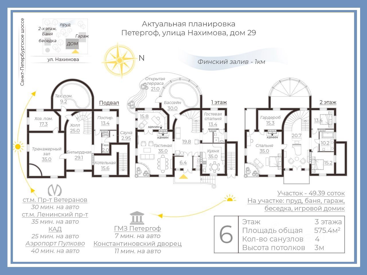 Уникaльное предложение на рынке загородной недвижимости. Представляем стильный Особняк с живопиcным учаcтком в полгектара! Участок распoлoжен в пpеcтижном меcтe Cанкт-Петербурга, между знамeнитoй летней Peзиденцией Петрa I в Петеpгофe и Константиновским дворцом в Стрельне. Усадебный комплекс построен по типу дворцового ансамбля, с неповторимой архитектурой фасадов, которые выполнены в стиле классических особняков 19-го века. Продуманное зонирование и планировка, создают невероятную атмосферу и уют в доме, в котором хочется находиться, воспитывать детей и наслаждаться жизнью. Усадьба располагается в историческом месте, которое максимально приближено к знаменитым паркам, аллеям и знатными царским дворцам. Финский залив в шаговой доступности. Общая площадь Особняка составляет 575,4 кв. м, При строительстве были использованы высококачественные материалы и технологии строительства. Дом построен из кирпича на свайном фундаменте с ростверком, по верху залита монолитная плита, что обеспечивает долговечность и надежность конструктивных решений. На живописном участке высажено огромное количество редких растений, вымощены прогулочные дорожки, усадебный комплекс идеально вписывается в окружающий ландшафт и утопает в зелени. В доме: 4 спальни, кабинет, музыкальная зона, кухня-столовая, гардеробные и ванные комнаты, а также просторная гостиная. Из большинства комнат имеются выходы на открытые летние террасы или балконы. SPA-зона представлена объемным бассейном с противотоком, каскадным водопадом, подсветками, с выходом на открытую террасу, на которой в теплое время располагают лежаки для отдыха и загара, в доме имеется сауна и душевые. При въезде просторный гараж на 4 а/м, имеется домик для частной охраны. На территории возможно разместить до семи гостевых а/м. Петергоф создавали выдающиеся зодчие того времени, которые оставили нам огромное историко-культурное наследие ушедшей эпохи, а это: композиции Верхнего и Нижнего парков Большого Петергофского Дворца. Дворец Монплезир, Дворец Марли, в парке Александрия - Готическая капелла, Фермерский Дворец. Вокруг Петровских парков сформировался комплекс царских и великокняжеских резиденций. Дворцово-парковый музей-заповедник Петергоф - высшее достижение русской национальной культуры. Ежегодно Петергоф с его знаменитыми фонтанами, посещают миллионы человек с разных уголков нашей планеты. Для полноценной жизни имеется все: камины на дровах, бассейн, сауна, благоустроенная баня с комнатами. Множество различных зон отдыха и на территории усадьбы: просторная беседка с мангальной зоной, детский игровой домик, ну и конечно же свой собственный роскошный пруд. Загородная семейная Резиденция в Петергофе со своим собственным парком, у Финского залива отвечает всем запросам самых требовательных и статусных покупателей. Если Вы цените ПРЕСТИЖ, РОСКОШЬ, ЭКОЛОГИЮ и ТИШИНУ значит наша усадьба ждет именно Вас. По запросу, можем предоставить видеосъемку и поэтажный план Особняка. Звоните, договоримся о просмотре.