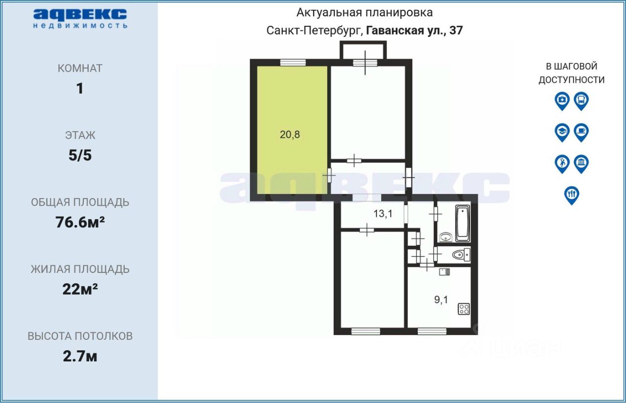 продам комнату, Гаванская, 374 700 000 ₽